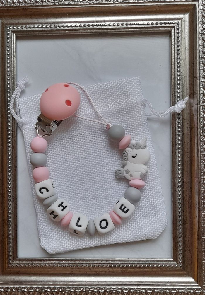 Attache tétine personnalisé avec le prénom de votre choix tout le matériel utilisé est aux normes européennes . Perles en silicone ou en bois ou un mélange selon les modèles . En respectant les normes de sécurité pour bébé ,n'hésitez pas à regarder dans mon dressing il y a plus de 150 modèles et aussi à m'envoyer un message pour plus d'informations. 🔴 une petite remarque pour les prénoms qui sont très long il y aura forcément moins de perles sur les cotés ou quelques changements sur le modèle c'est pour respecter les normes de sécurité pour bébé il y a une langueur à respecter merci pour votre compréhension. 🔴Aussi l'utilisation de l'attache doit être sous surveillance et toujours vérifier si l attache tétine est intacte et les nœuds sont toujours bien fermés pour la sécurité de nos boutchous. Je vous remercie pour la lecture de ces consignes