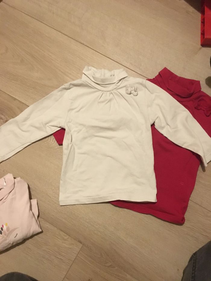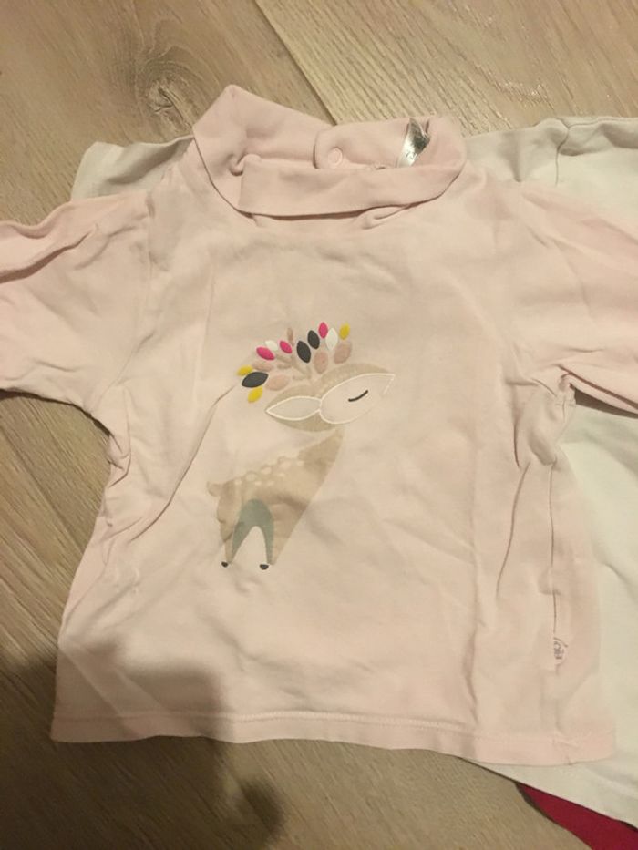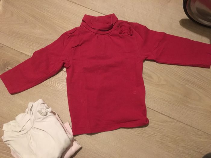 Lot de 3 sous-pulls « okaïdi et kiabi » 12 mois. le rose pâle est de okaïdi et les 2 autres kiabi. en bon état juste le bordeaux un peu terni et une tâche sur l’intérieur qui ne se voit pas porté .