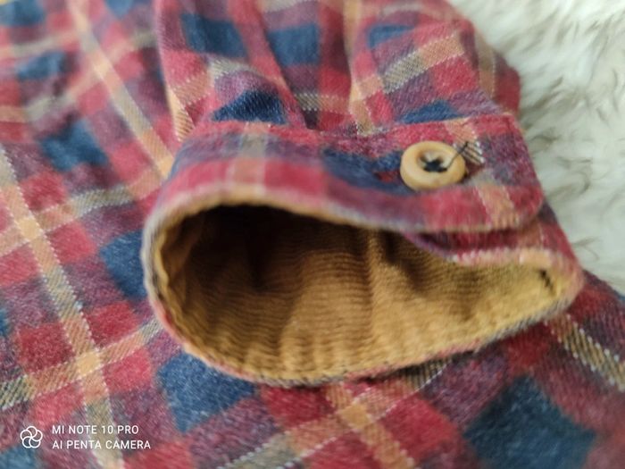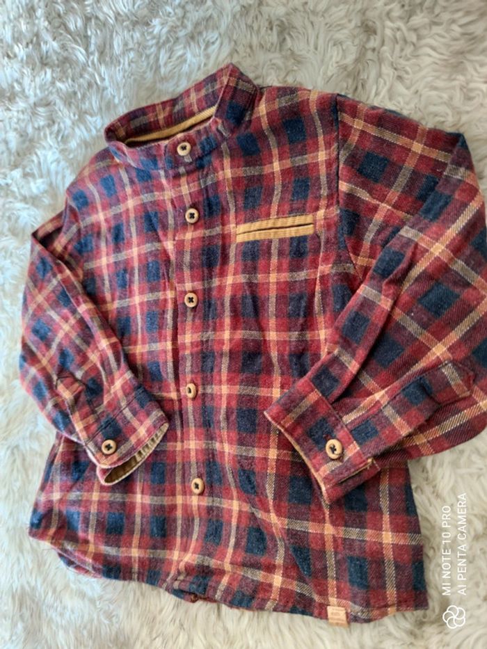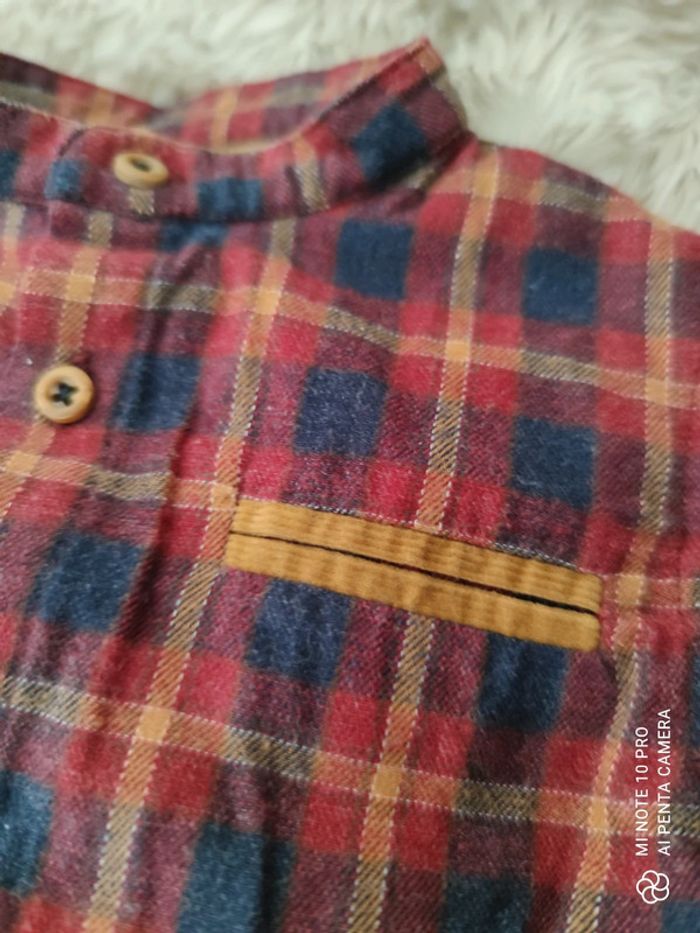 Très jolie chemise à carreaux, manches longues, col mao, couleurs d'automne (bordeaux, camel, bleu marine) avec détails en velours sur le col, la poitrine et les poignets, boutons effet bois. Lavée mais non portée car ce n'était pas la bonne saison pour notre bébé. Taille 3-6 mois : correspond davantage à du 6 mois. Marque Zara babyboy Réduction sur les lots