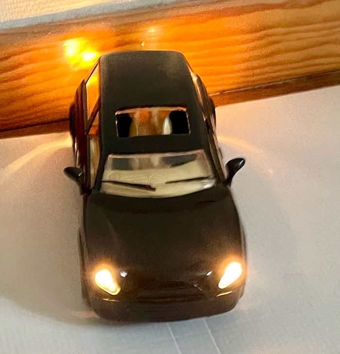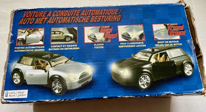 Voiture à conduite automatique Feux clignotants Klaxon Bruit de moteur Contact et esquive : la voiture tourne et poursuit sa course quand elle rencontre un obstacle Les portes s ouvrent Fonctionne avec 4 piles AA (non fournies ) La boîte est abîmée La voiture est en TBE et fonctionne parfaitement L 20 cm