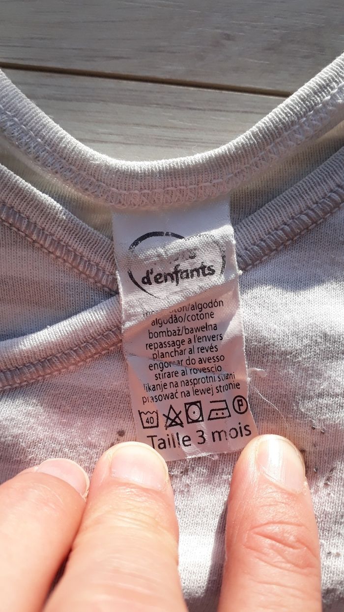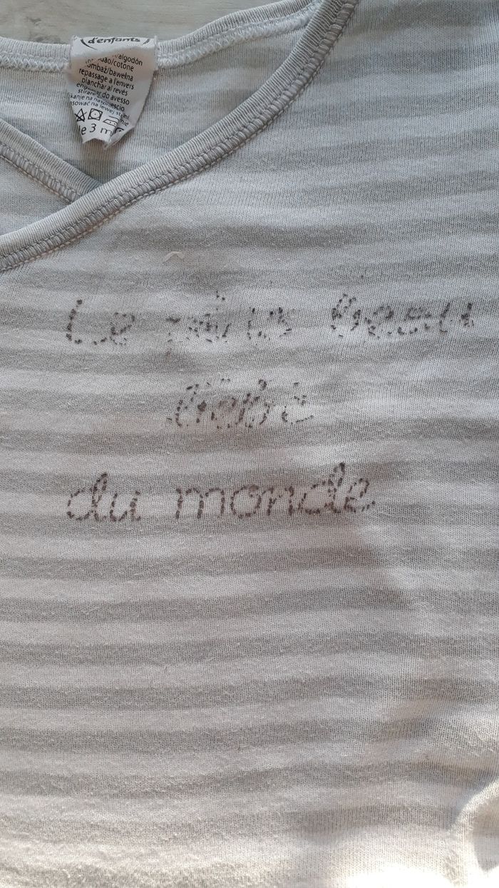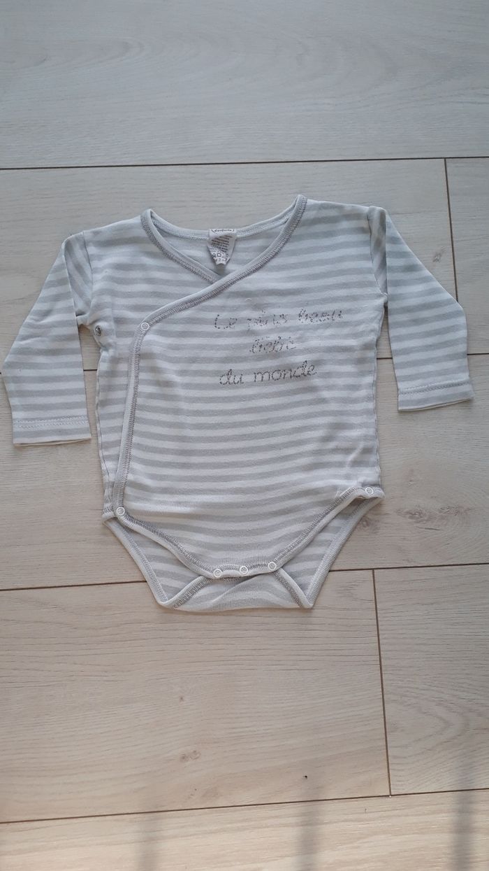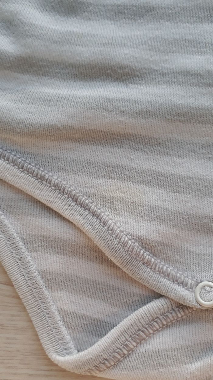 Bodie a manche longue, rayé gris et blanc. Pression sur le devant et entre les jambes. Imprimé qui commence a s'effacer. Peut être mixte Taille 3 mois