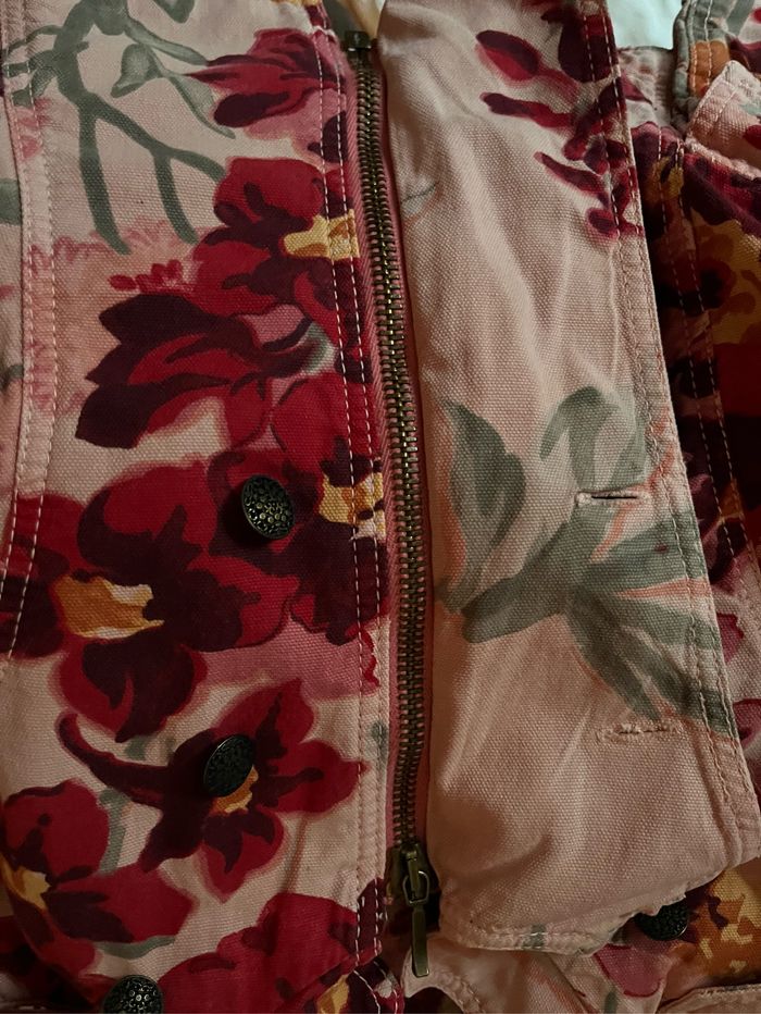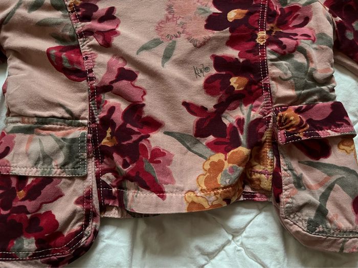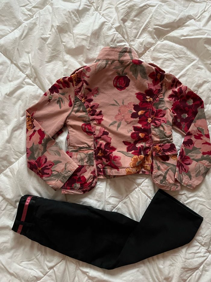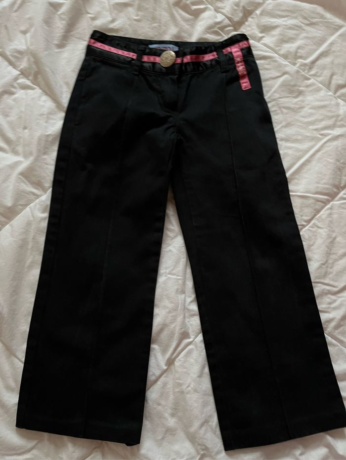montant. Poches de chaque côté. Boutons fantaisies sur l'épaule gauche. Pantalon coupe droite. Liseré satin rose au niveau de la taille. Passants pour ceinture. Fermeture par zip et bouton crochet caché par un vrai bouton fantaisie. Elastique ajustable à la taille. Composition 100% coton