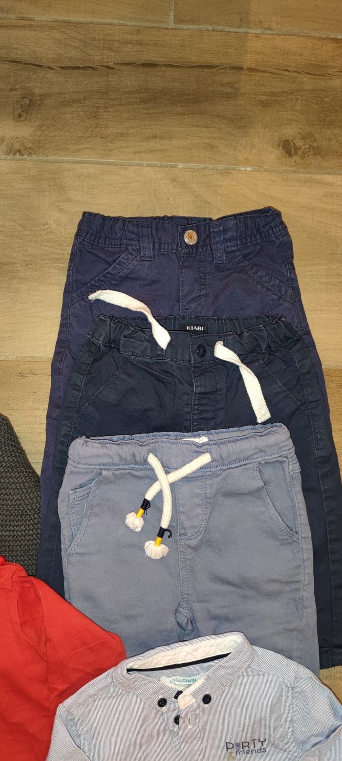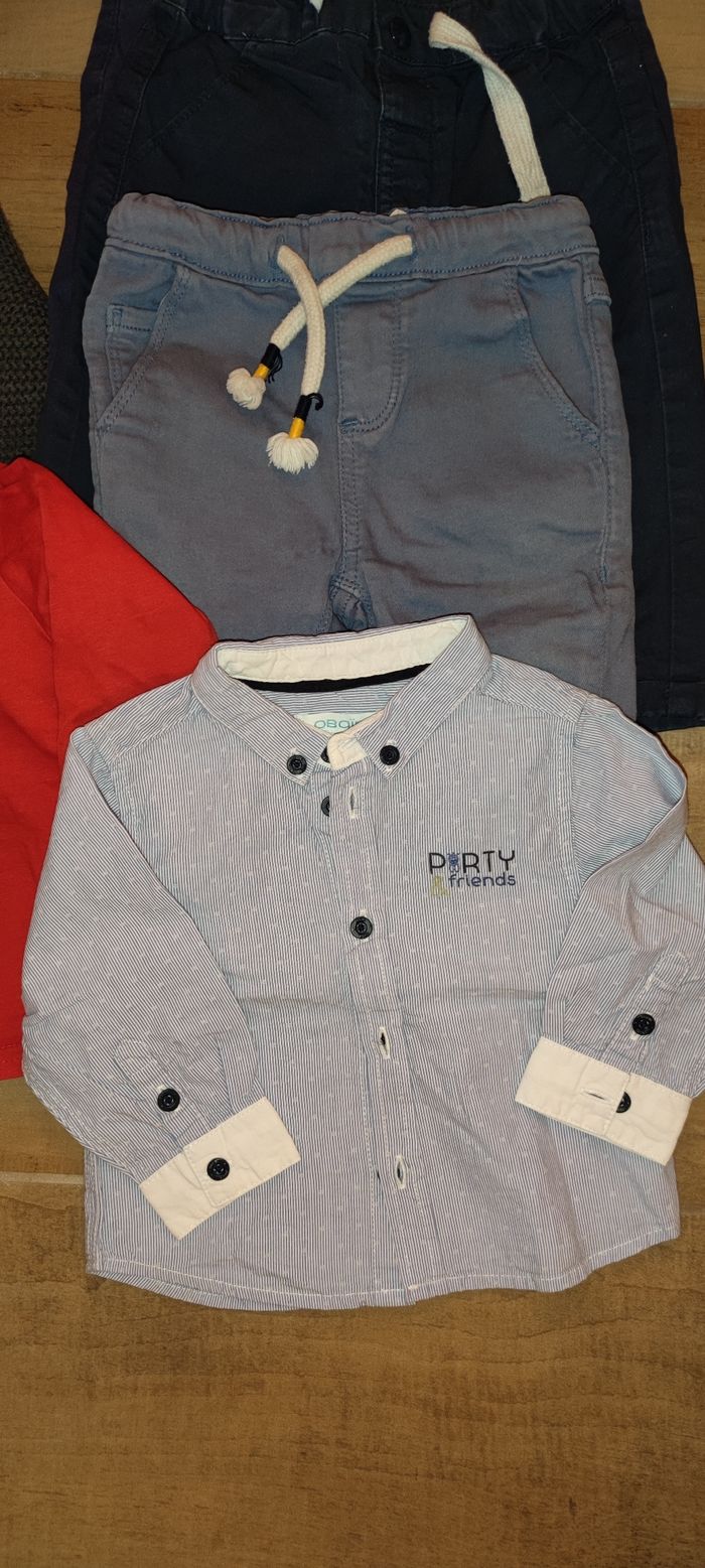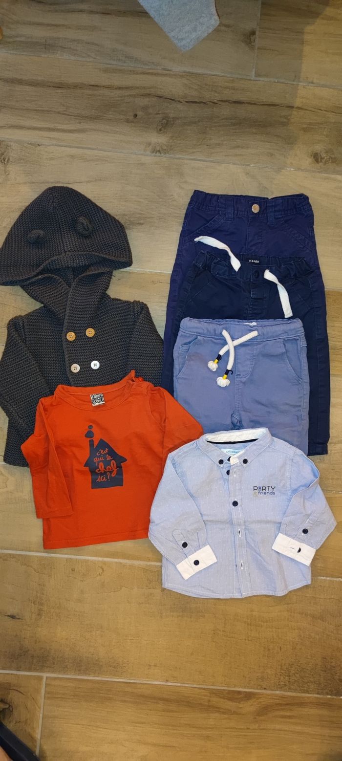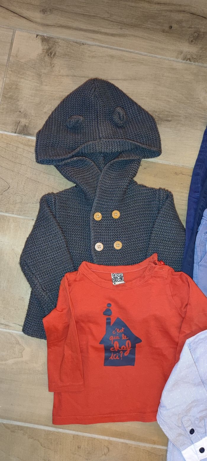 Lot en 6 mois, composé de : Un gilet à capuche (Kiabi) Un t-shirt Manche longue (tao) Une chemise manche longue (obaibi) 3 pantalons (Kiabi, tao, Eden et Victor) Un des pantalon est légèrement marqué au niveau du genou (rampé ..) je vous ai mis la photo ;-) N'hésitez pas à m'écrire sii vous souhaitez séparer le lot ;-)