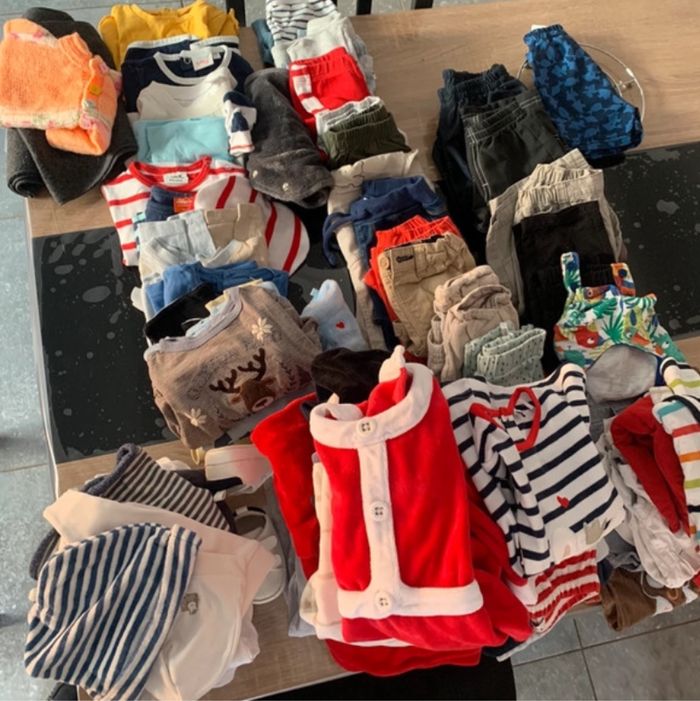 Gros lot vêtements bébé garçon en 6 mois qui comporte: -une quinzaine de paires de chaussures -une dizaine de bonnets fins -une dizaine de bodies -une quinzaine de tee shirt, tee shirt manches longues -une quinzaine de pyjamas - une vingtaine de pantalons, shorts - quelques salopettes Quelques vêtements en 9 mois. LE COLIS DOIT PARTIR RAPIDEMENT!