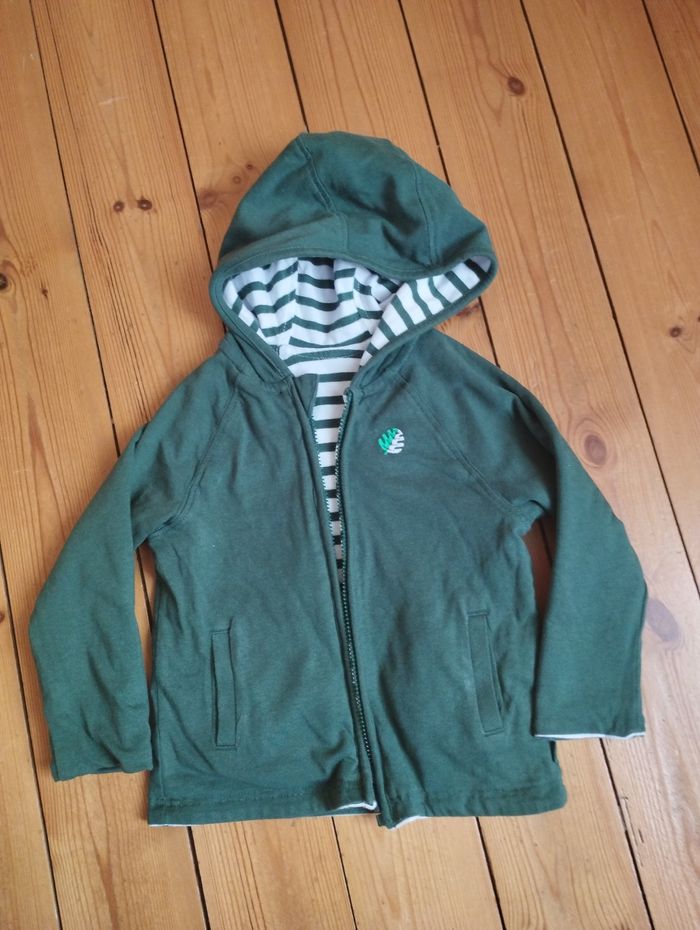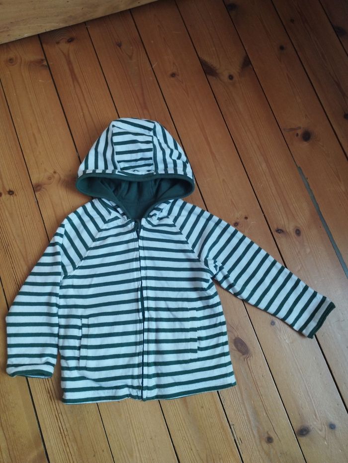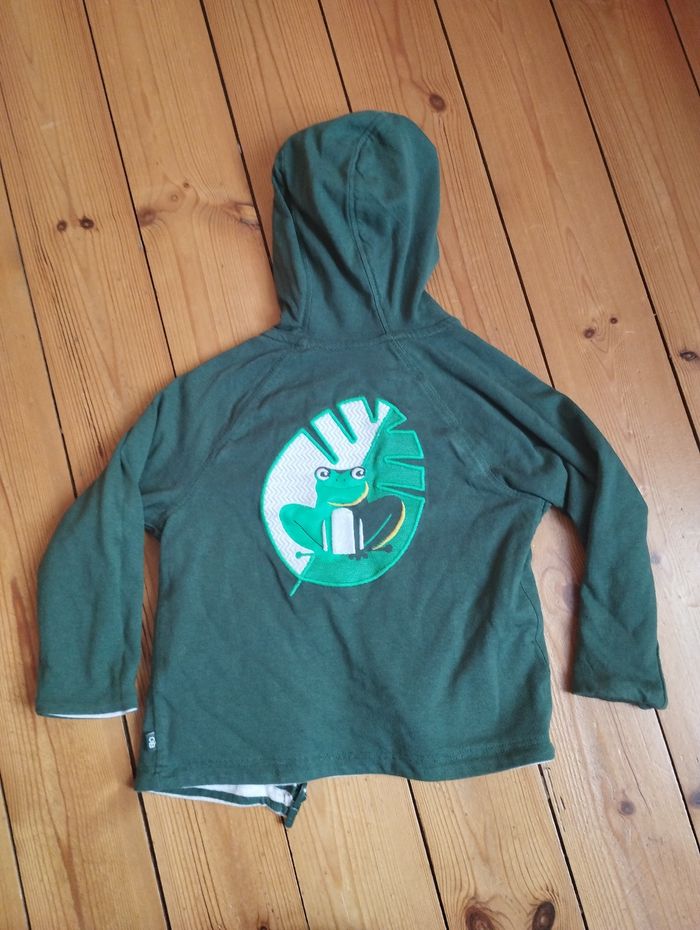 Veste réversible de la marque Obaïbi Taille : 12 mois, 74 cm. Un côté à rayures vertes et blanches, un côté uni vert avec une broderie grenouille à l'arrière.