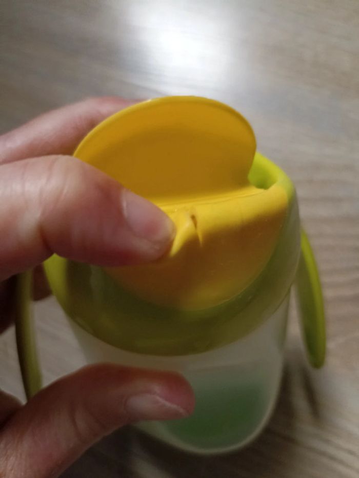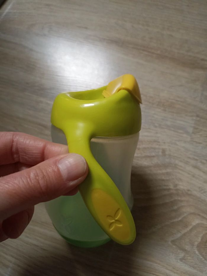 Petite gourde très pratique avec poignée pour bébé idéal pour les sorties ou la maison. Son bouchon est facile à ouvrir et il suffit d'appuyer sur l'ouverture pour que l'eau passe. Aucun risque de fuite État neuf j'ai d'autre verre a bec si jamais dans mon dressing.