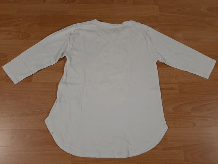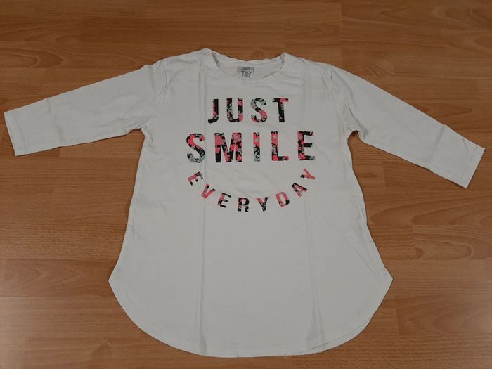 T-shirt blanc maches 3/4 inscription à fleurs "Just smile everyday ". Marque OVS. 100% coton. Taille 13-14 ans (164 cm).