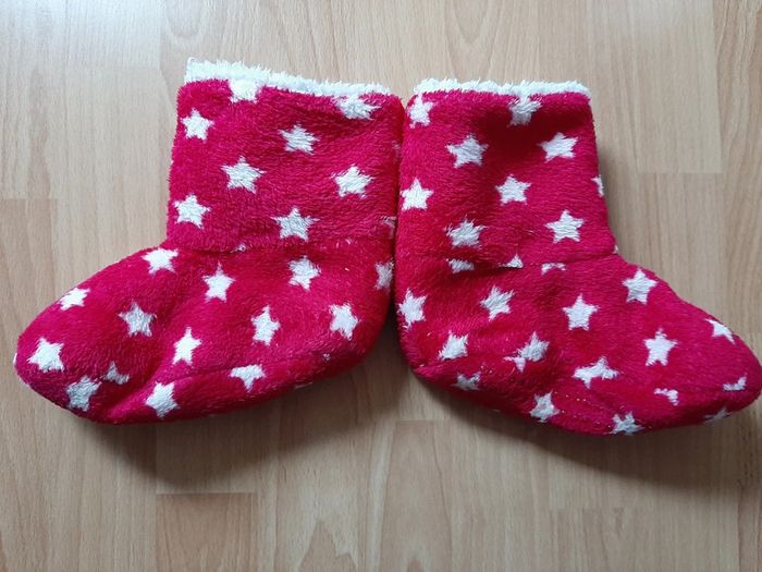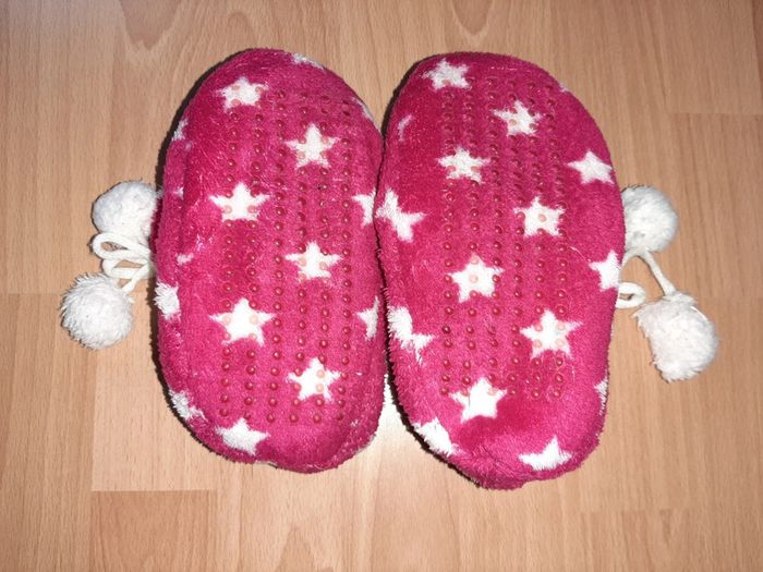 Pantoufles montantes/ bottines en fausse fourrure. Rose fuchsia imprimé étoiles blanches avec pompons. Semelles antidérapantes. Tailles 30-32. Longueur du pied: 20 cm environ. Pour consulter toutes mes annonces tapez mielisi.