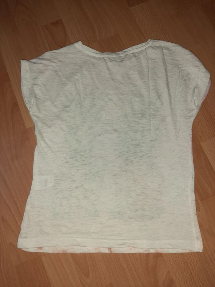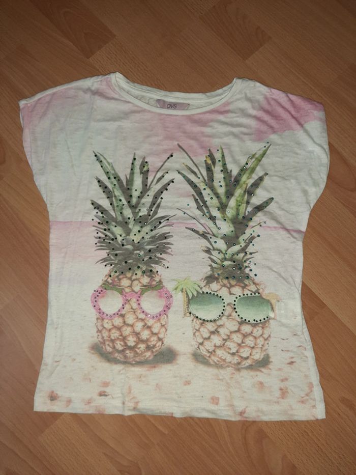 Tshirt manches courtes motifs ananas avec strass verts et bleus. 65% polyester 35% coton (légèrementtransparent). Taille 13-14 ans.