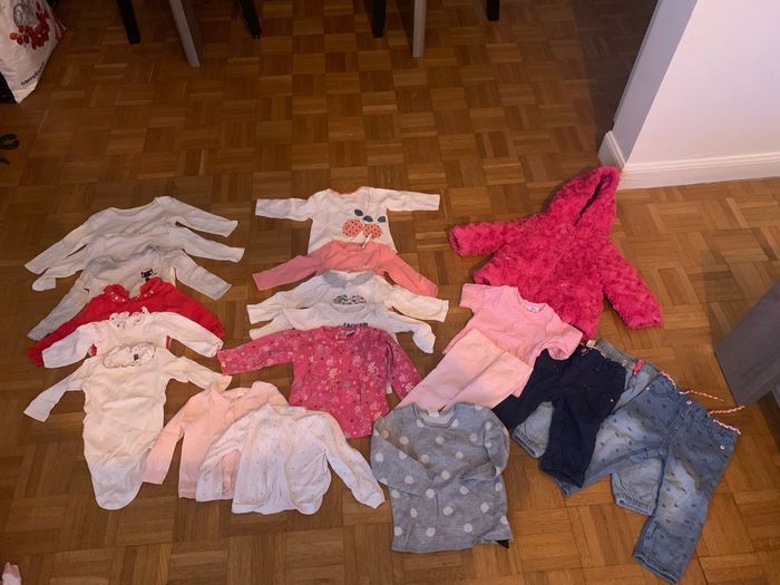 6 bodys manches longues 2 gilets 1 pull 5 tee-shirts 1 pyjama 2 pièces 3 pantalons 1 manteau Marques diverses