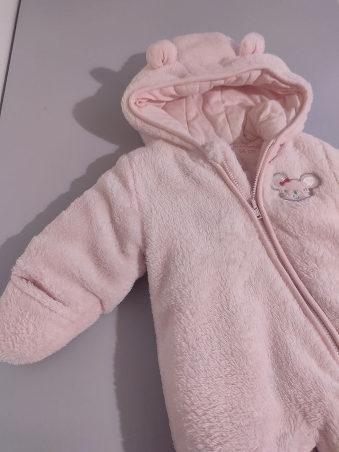 Combipilote chaud taille 1 mois (56cm) Comme neuf, porté 2/3 fois Rose pâle, tout doux, avec capuche à oreilles