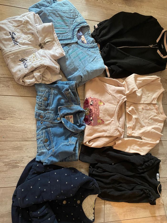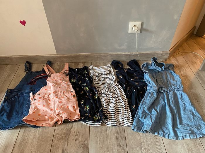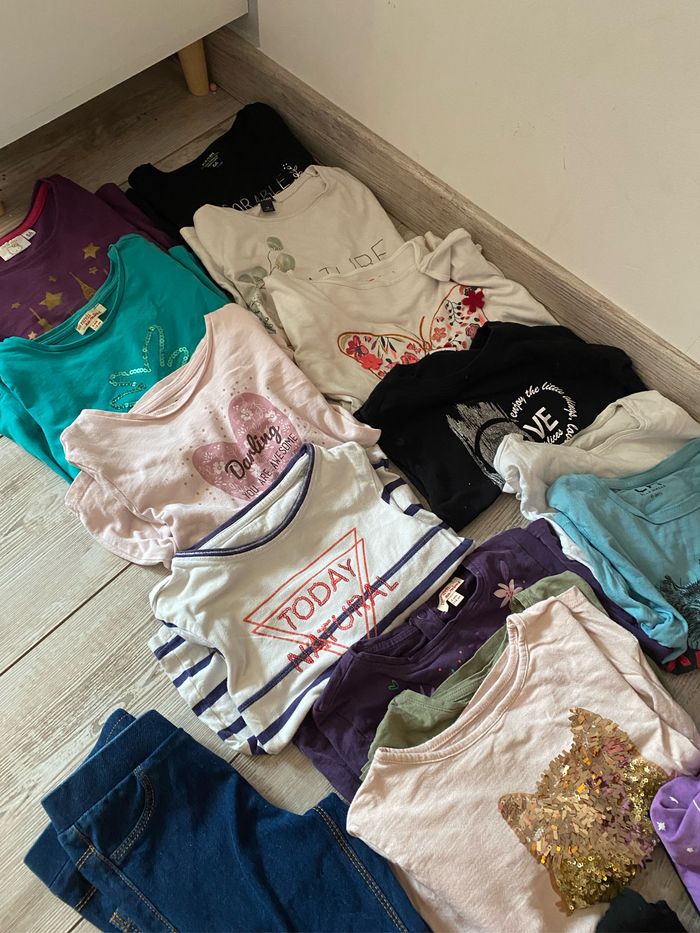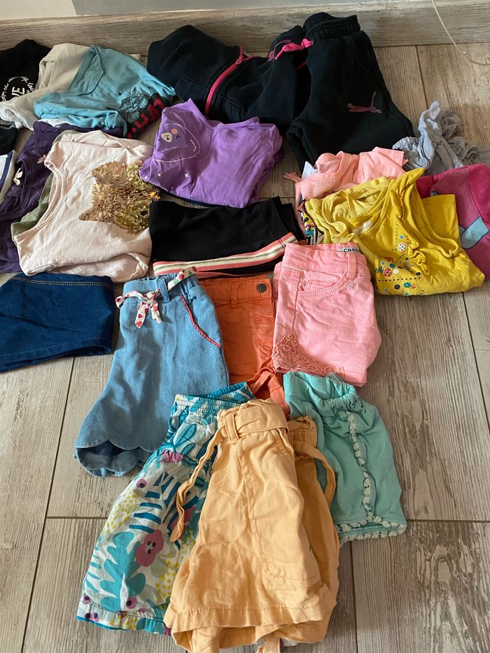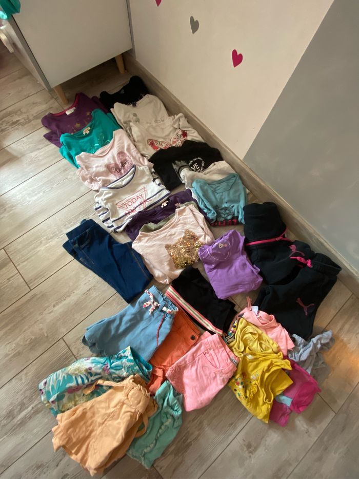 Un peu plus de 40 vêtements. Certains comportent des petites tâches mais l ensemble et quand même en bon état et parfait état pour la plus part. 13 manches longues 5 short 1 jupe 1 Jegging 1 pantacourt 1 pyjama 1 ensemble jogging puma 5 theeshirt 5 robes ou salopettes 8 veste pull gilet…