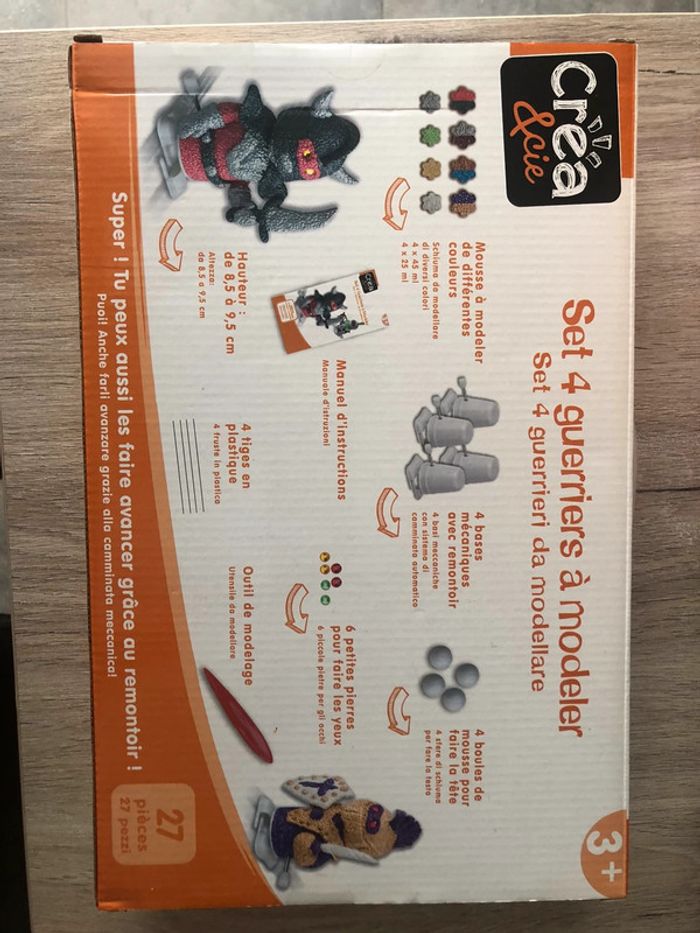 Set pour créer 4 figurines de guerriers avec de la mousse à modeler. On peut aussi les faire avancer grâce au remontoir (système mécanique). La boîte contient de la mousse de différentes couleurs, des pierres (sequins) pour faire les yeux, des outils en plastique et des instructions. Neuf dans son emballage