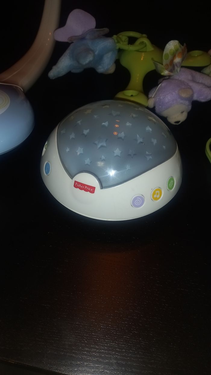 Mobil bébé avec petits oursons papillon qui tournent. Peu servir de veilleuse également avec 3 styles de music differentes ( nature, melodie, ocean ). 2 intensités de lumières qui diffusent des étoiles au plafond.