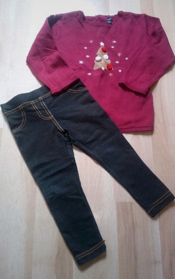 En bon état, petites taches sur le pull et couture du jegging qui est mal faite à l'arrière mais sinon nickel. Pull peu porté. Taille 3 ans