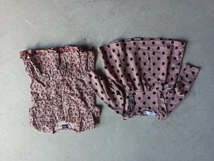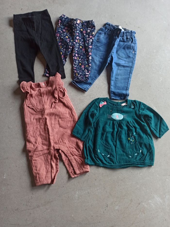 Lot de vêtements de différentes marques. Le lot se compose de 7 robes, 2 pyjama, 3 gilets, 1 pull, 5 pantalons, 5 leggings, 2 body, 1 survêtement, 8 bandeaux, 2 bonnets, 1 paire de moufles et 11 paires de chaussettes. Marques présentes Sergent major, Zara, tape à l'oeil, Kiabi,H&M...