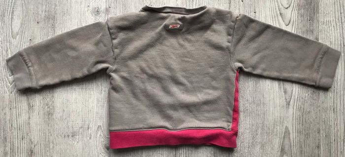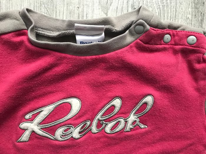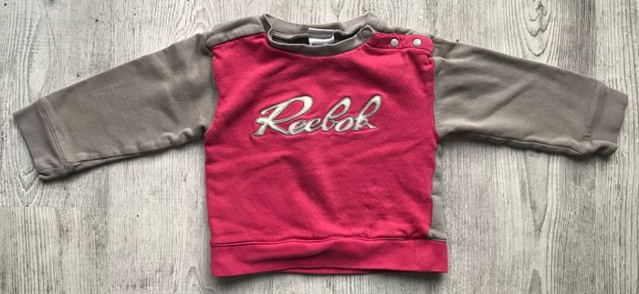sweat de la marque Reebok taille 24 mois / 2 ans présence de petites bouloches et petites traces rose sur les bords de la manche droite (voir photos) occasion, bon état