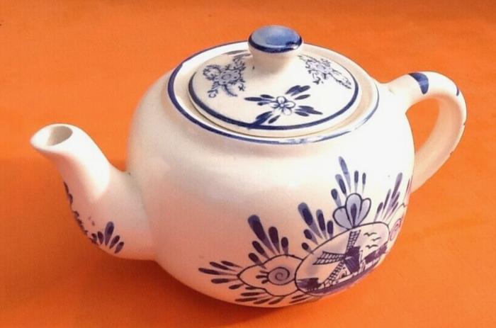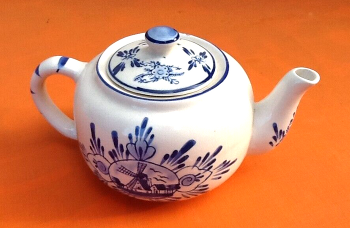 Théière ancienne Faïence Delft (Hollande) bleu peint à la main Décor Floral / Moulin à vent Contenance : 50cl Longueur : 185mm Hauteur : 100mm Poids : 330grs