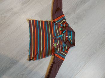 80 % coton et 20 % polyester. Se ferme avec boutons à l'avant. Motif sur le devant gauche. Couleur légèrement défraîchi sur les manches (Dernière photo) Inscrit 18 mois sur L'étiquette, mais taille petit