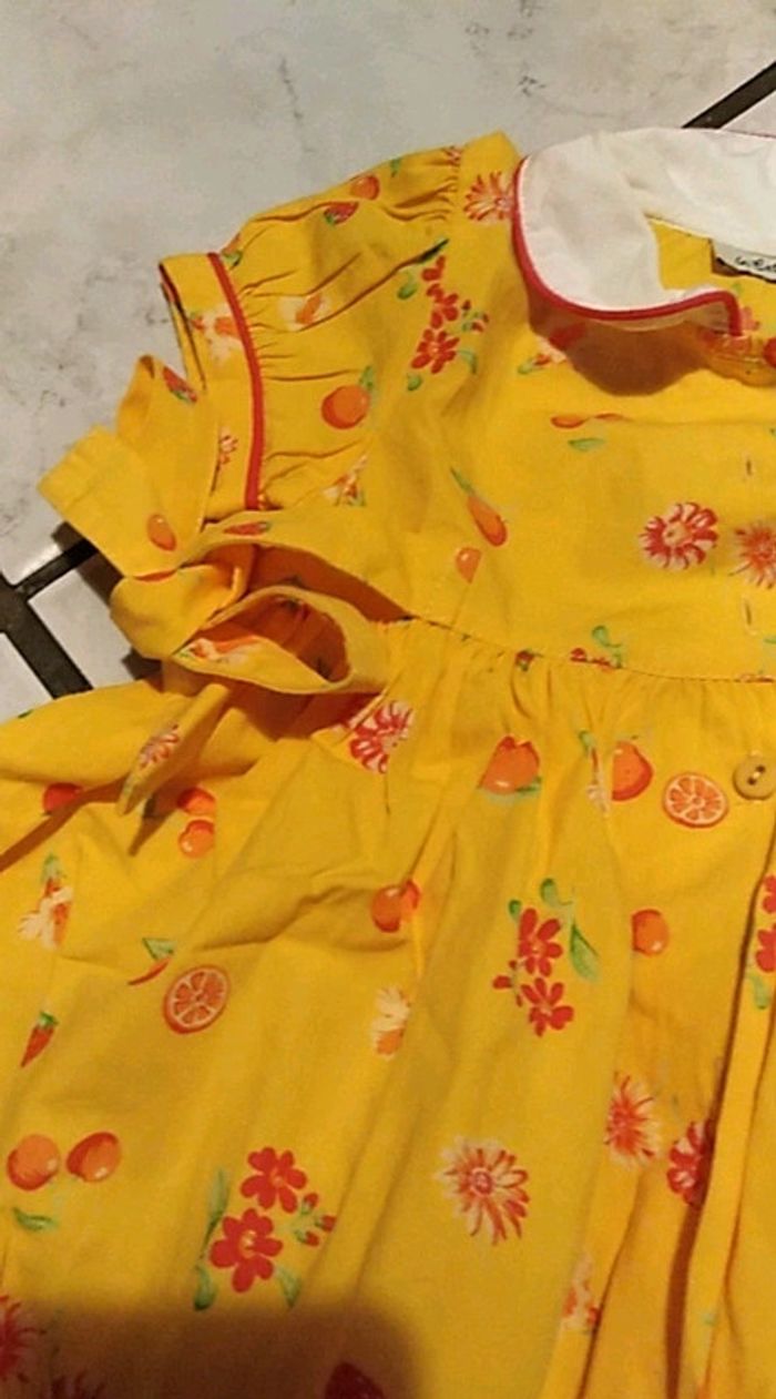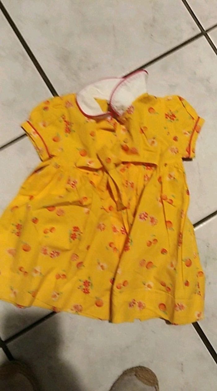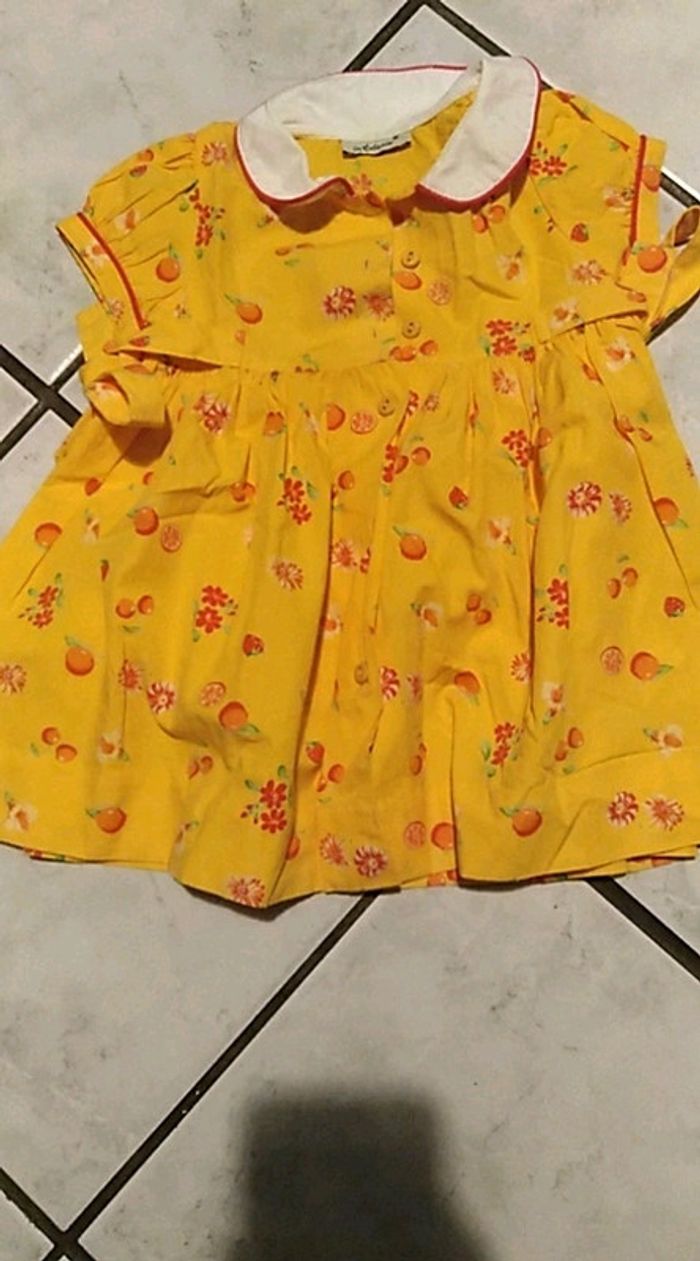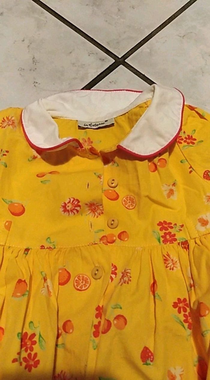Robe jaune poussin, avec motifs fleurs et fruits. Col blanc. 2 nœuds sont possibles de chaque côté de la robe. Ou encore au milieu, un à l'avant, l'autre à l'arrière. Pour ma part je les mettrai sur le côté,