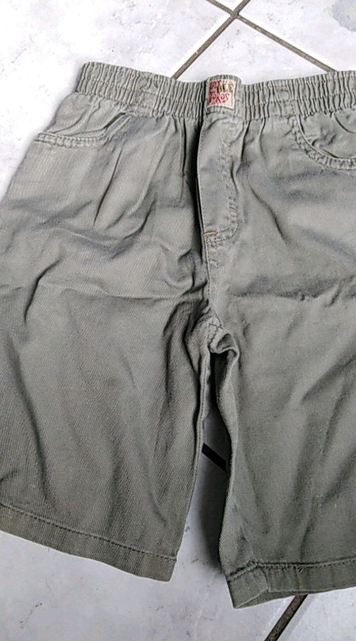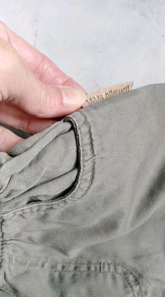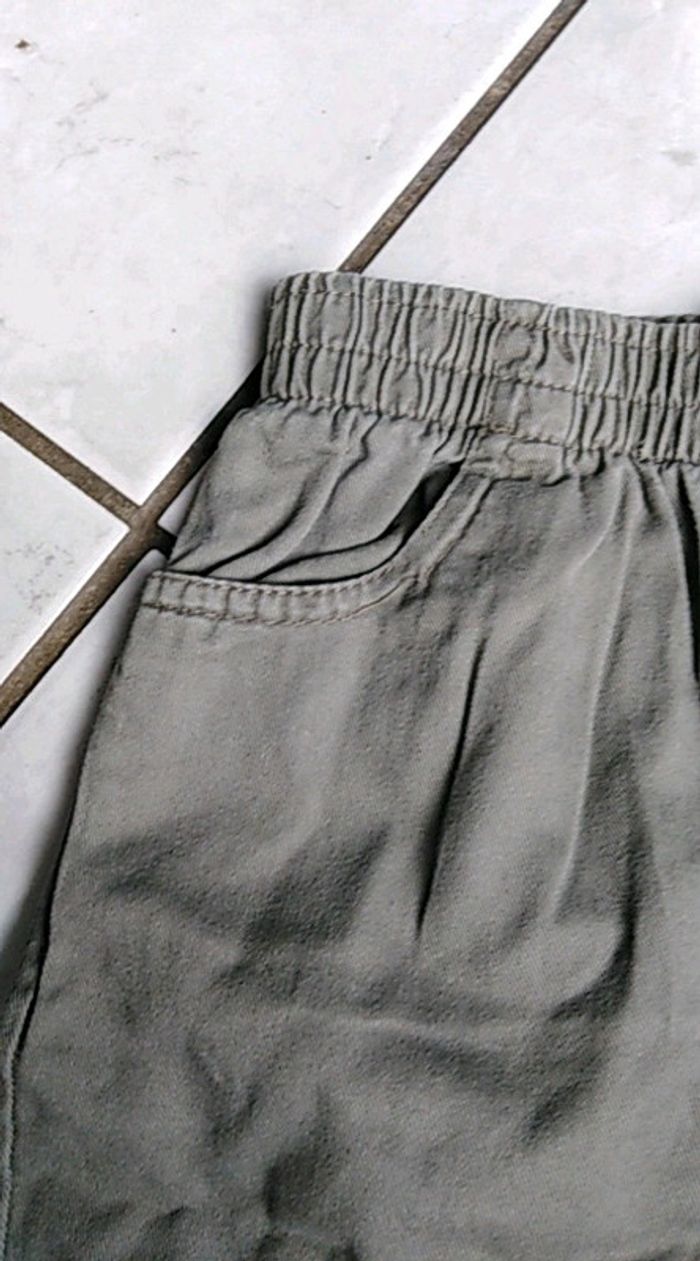 Short vert kaki, avec 2 poches sur le côté à l'avant, Pas de fermeture, juste élastiqué à la taille. Pratique.