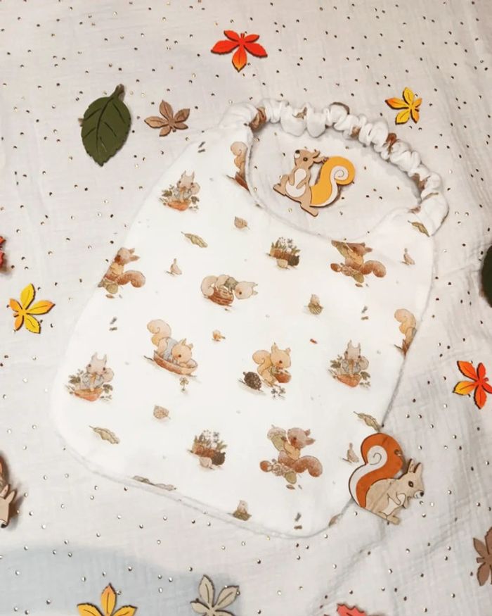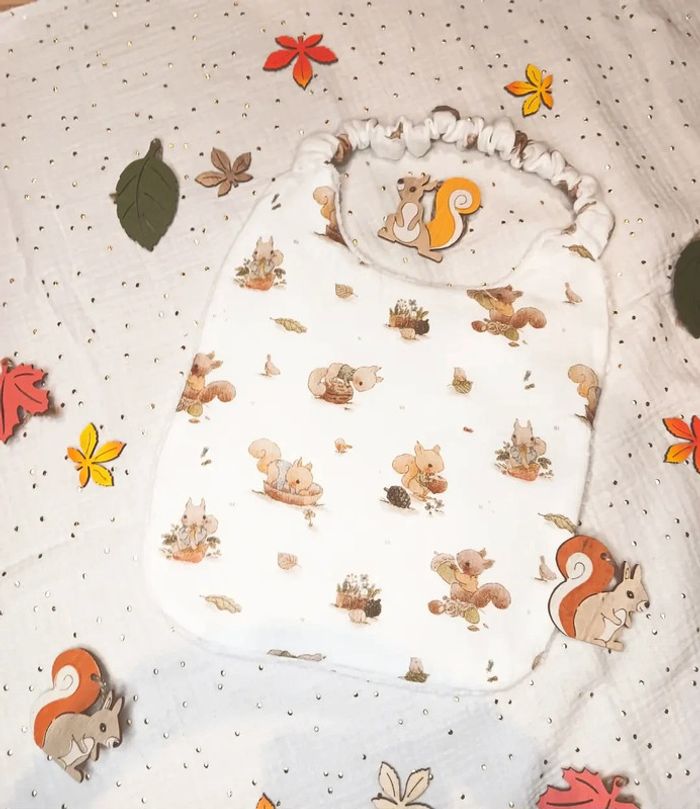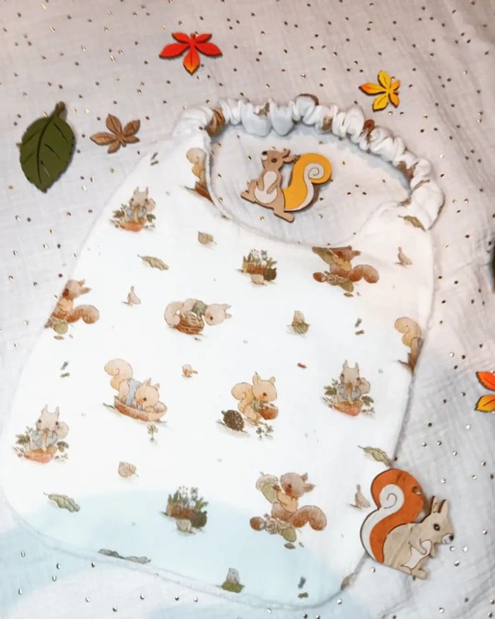 Jolie bavoir col rond avec élastique Motif écureuils Matières : Gaze coton et tissu éponge fibre de bambou (tissu epai) Fait main 🪡 Taille de la naissance à 3 ans Dimensions : Du haut du col au bas du bavoir 28cm sur largeur 23cm Du bas du col au bas du bavoir 22,5 cm sur largeur du bavoir 23 cm Largeur du haut du col 13 cm