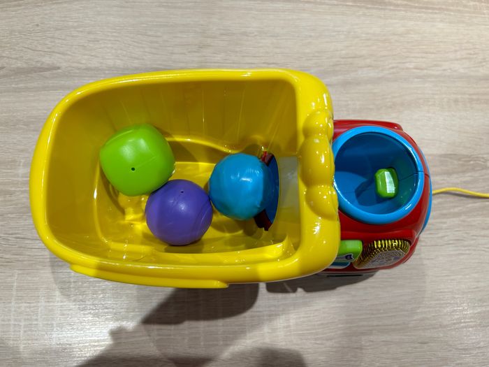Camion vetch tut tut bolide Il y a une ficelle pour le tirer et 3 balles à insérer sur le dessus avec différents discours et musique