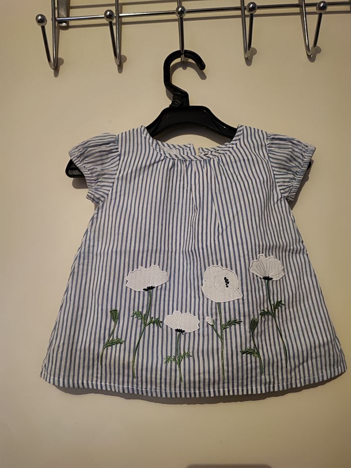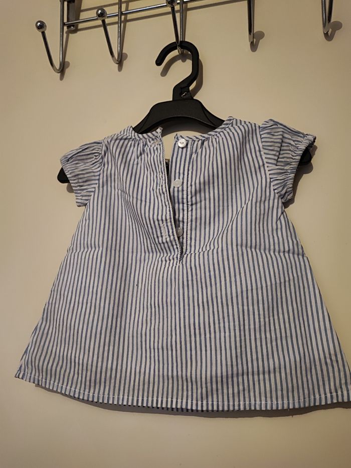 Superbe robe bébé fille Manches courtes Dos boutonné Taille 3 mois Coloris bleu rayé Motif a l'avant Fluide et légère Coton
