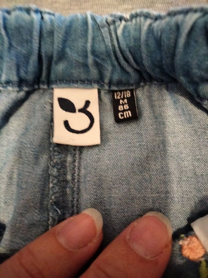 Taille élastique avec pression en fermeture Double pressions aux cuisses pour adapter à la taille de bébé Décor fleuri aux poches Effet jean mais matière fine et souple Taille 12-18m
