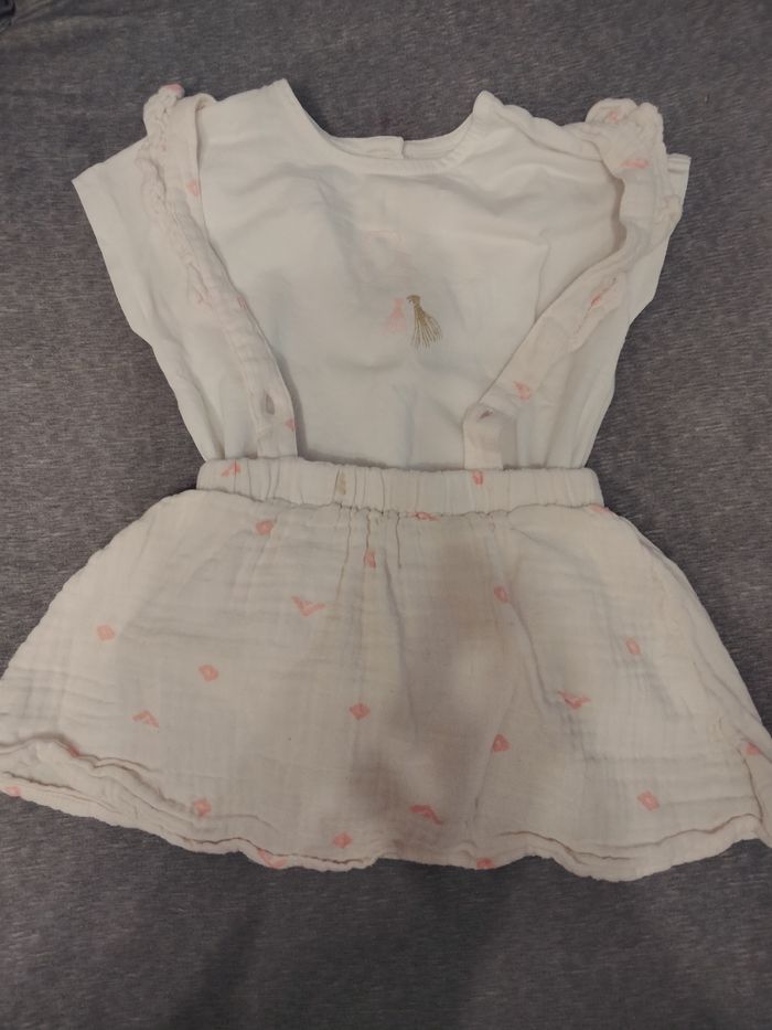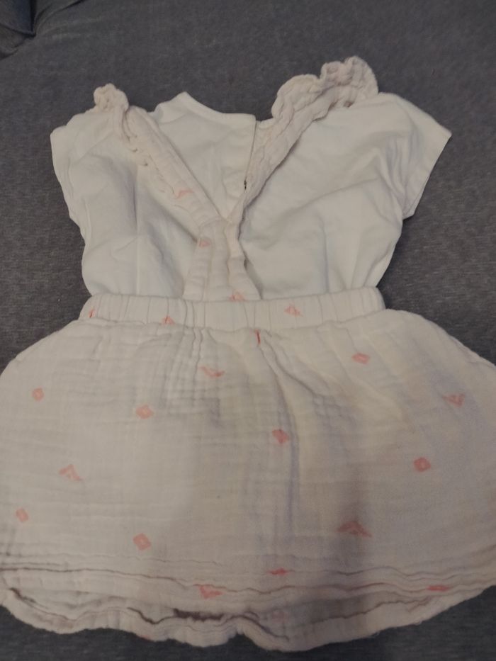 Ensemble t shirt + jupe culotte à bretelles Bretelles à froufrous réglables à 2 hauteurs Matière gaze de coton T shirt avec pressions en haut du dos Couleur rose pâle et corail fluo