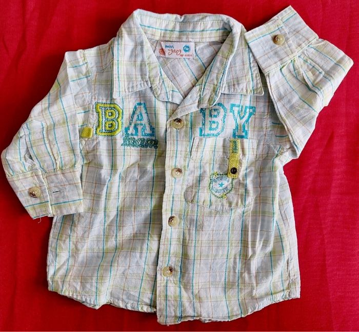Chemise manches longues 6 mois, mini gang A boutons, col et petite poche Bleu, vert, blanc 2€