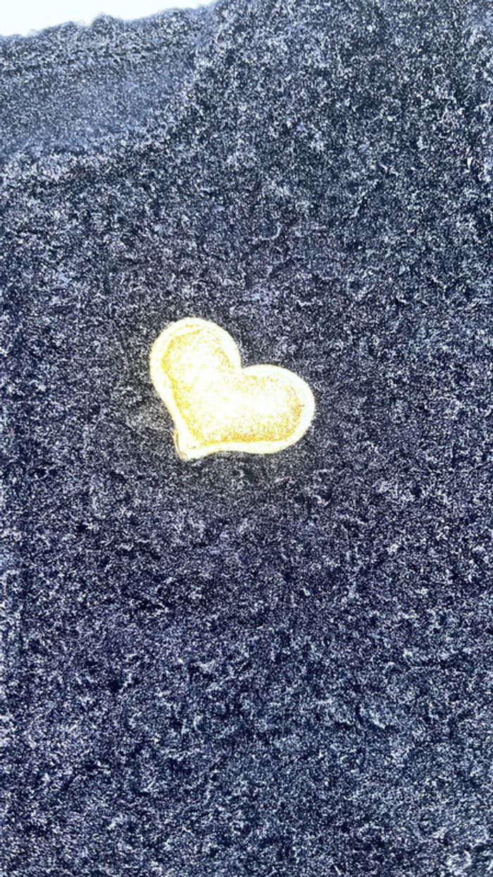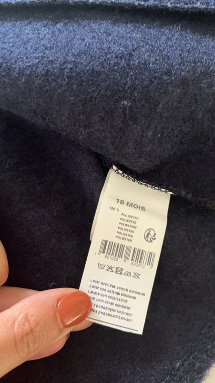 Veste bleu marine. Pas de boutons pour la fermer. Matière extérieure effet moumoute. Taille 18 mois.