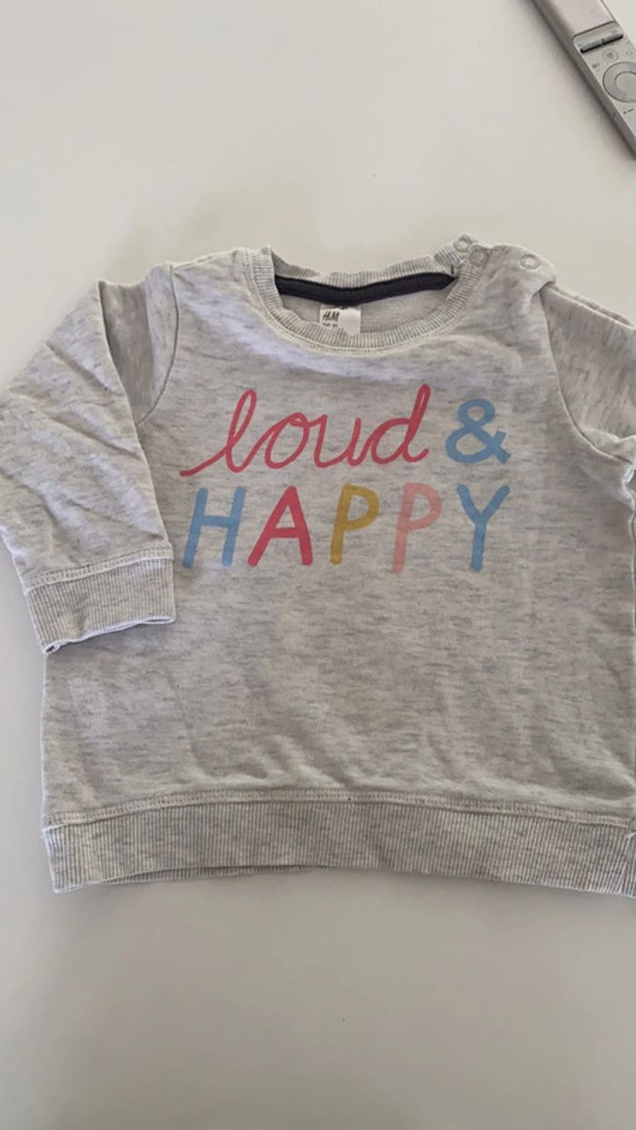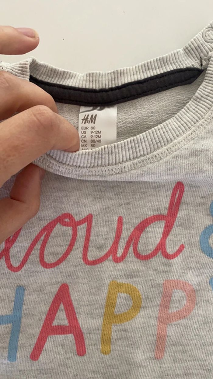 Sweat gris clair , fin , avec ecritures colorées Taille 80 (9/12 mois H&M qui taille plutôt grand)
