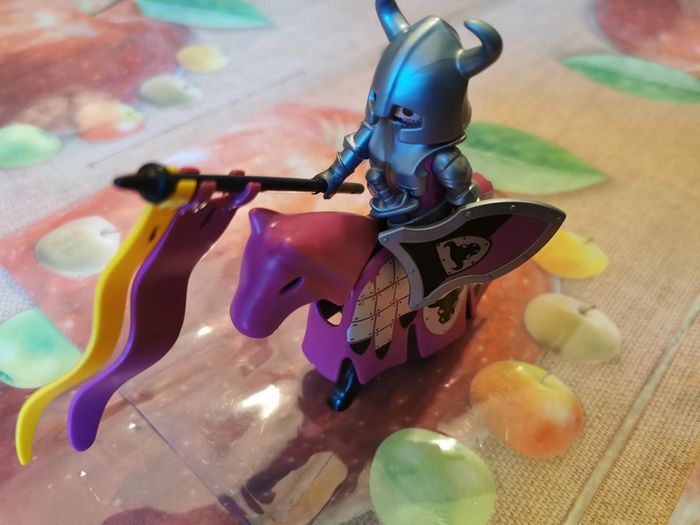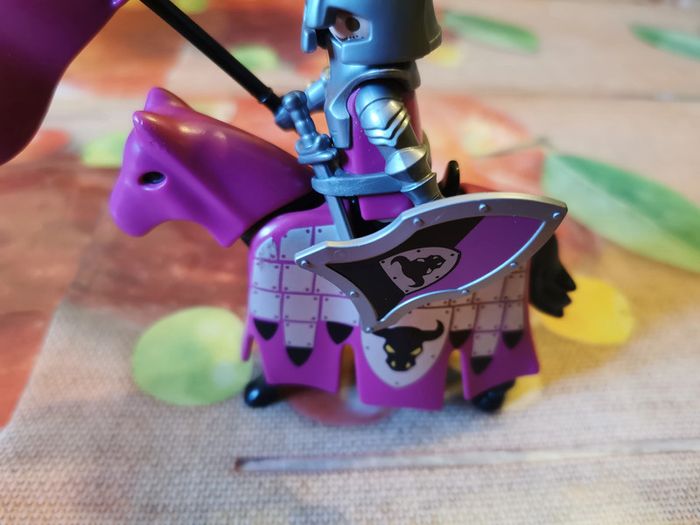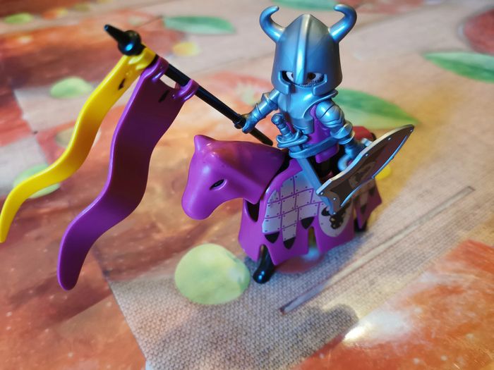 Chevalier barbare Playmobil référence 4436 de la collection Playmobil Knights, année 2005. Description : personnage, cheval, bouclier, drapeau, épée. En très bon état, il y a juste du marqueur sur le drapeau, c'est pour cela que je le vends moins cher. Réduction sur les lots à partir de 2 articles achetés.