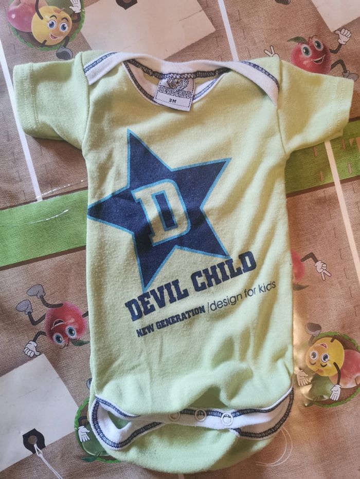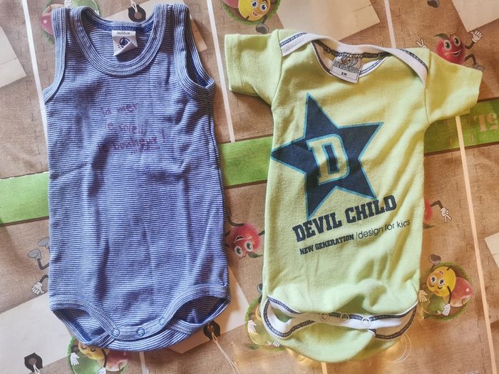 Lot de 2 bodys été taille 3 mois. - 1 body débardeur "petit bateau" bleu rayé avec écriture sur le devant en très bon état. - 1 body manches courtes "devil child" vert avec étoile et écriture sur le devant en bon état. Boutons pressions à l'entrejambe. D'autres vêtements bébé sont en vente dans mon dressing, réduction sur les lots à partir de 2 articles achetés.