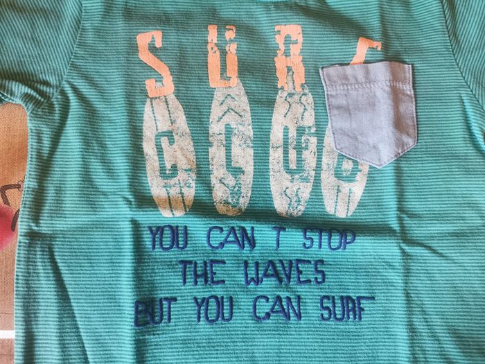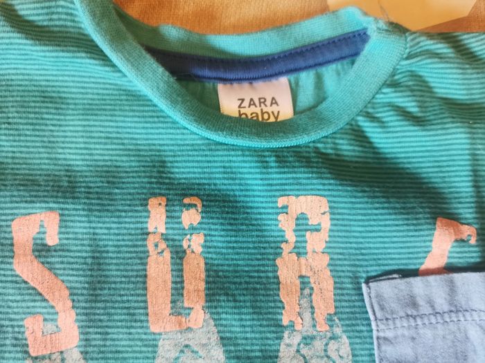 T-shirt manches courtes vintage des années 2005 "zara baby" taille 12/18 mois. Rayé vert motif surf avec 1 petite poche. En bon état mais le transfert est craquelé à des endroits. D'autres vêtements en 12 mois sont en vente dans mon dressing, réduction sur les lots à partir de 2 articles achetés.