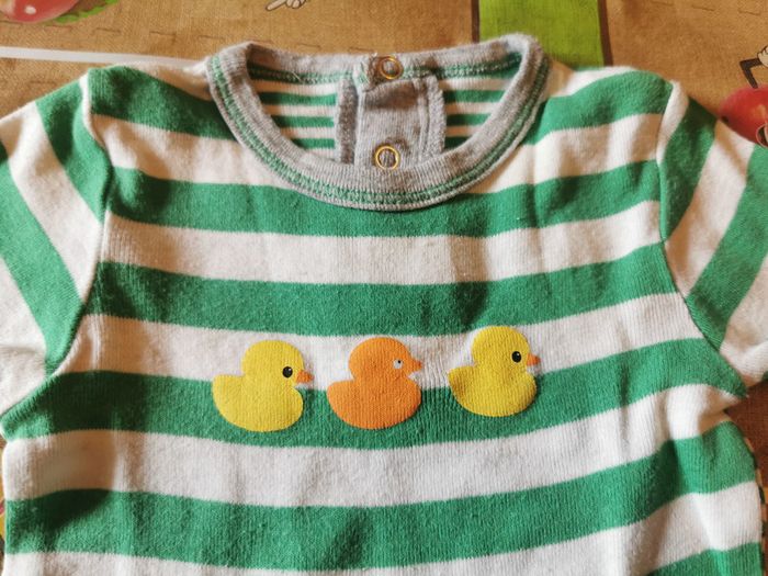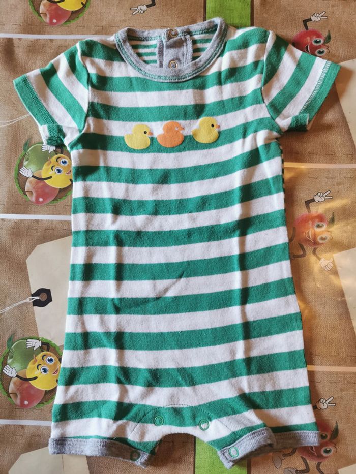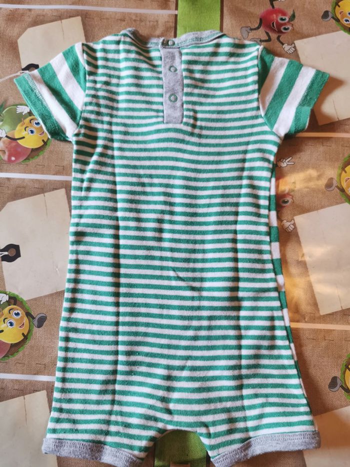 Combishort manche courtes "kitchoun" taille 6 mois. Rayé vert et blanc motif poussins. Boutons pressions sur le haut du dos pour le passage de la tête et à l'entrejambe. En bon état. D'autres vêtements bébé sont en vente dans mon dressing, réduction sur les lots à partir de 2 articles achetés.