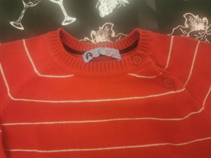 Pull fin "Ativo" taille 6 mois. Rouge avec rayure blanche. 2 boutons sur l'épaule pour le passage de l'épaule. Idéal pour la demie saison. En très bon état. Réduction sur les lots à partir de 2 articles achetés.