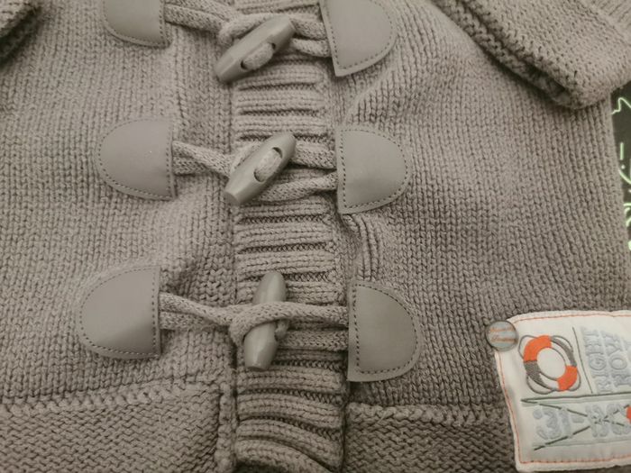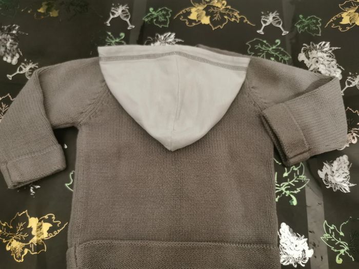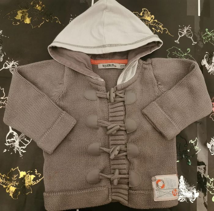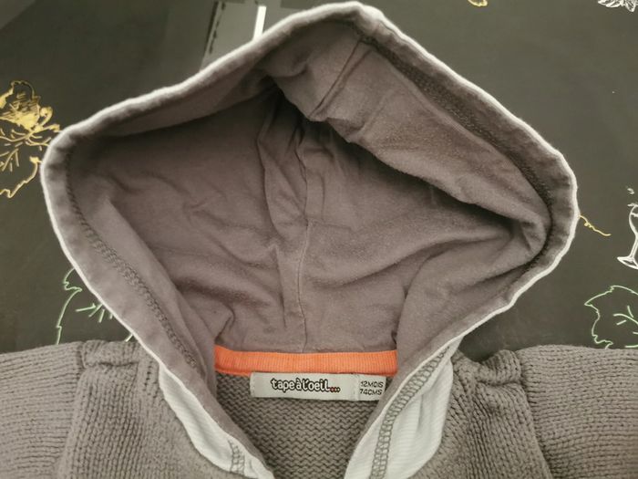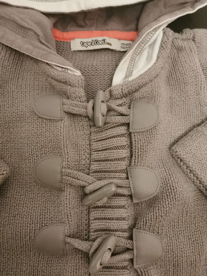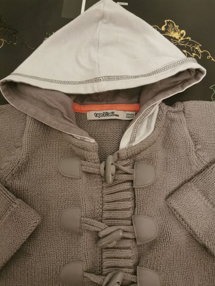 Gilet avec capuche "tape à l'œil" taille 12 mois. Gris, fermeture par boutonnage brandebourgs. En bon état.