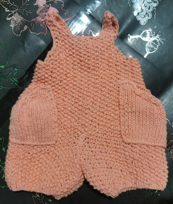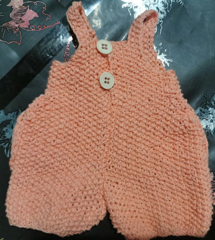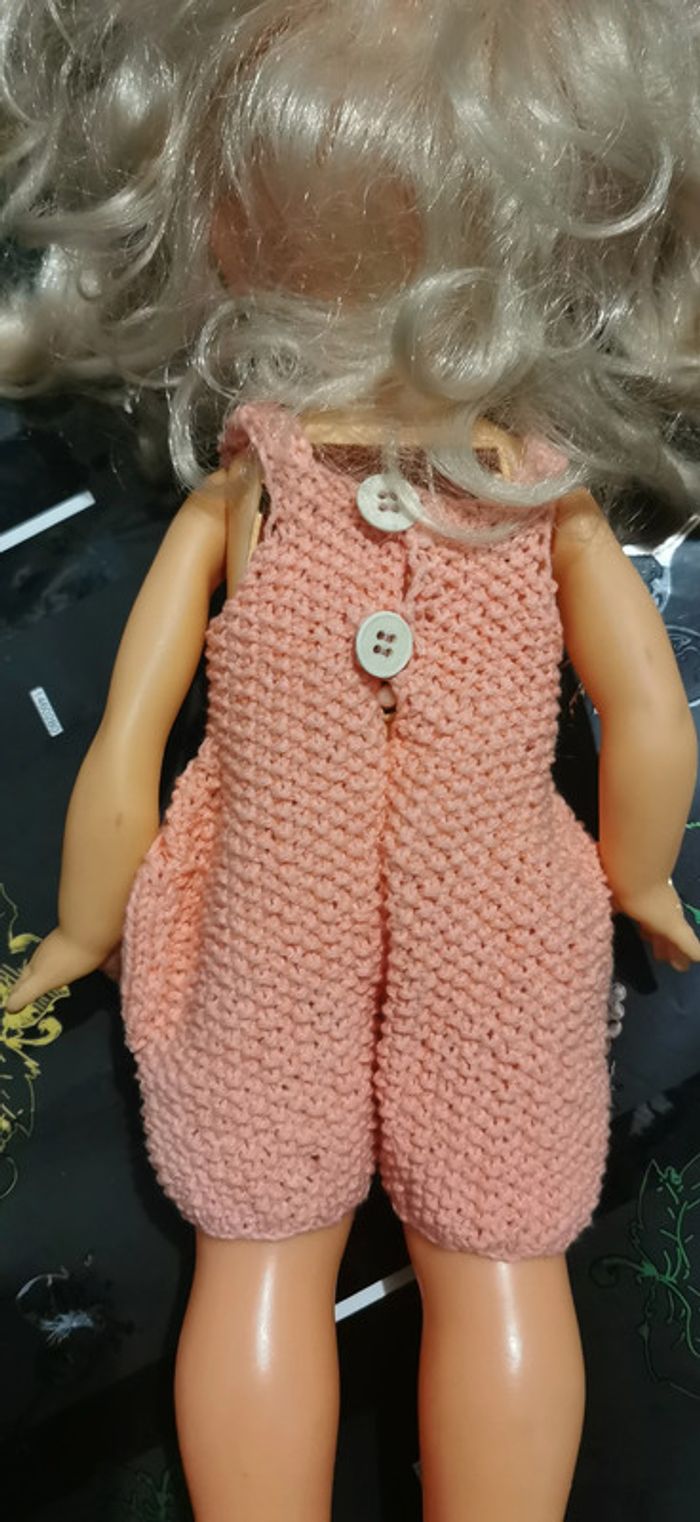 Vêtement tricoté à la main pour poupée de 30 à 40 cm. Salopette courte abricot . 2 boutons dans le dos. 2 petites poches sur le devant. Cette salopette a été tricotée par ma maman qui est passionnée par le tricot, elle est neuve. Vendu sans la poupée, elle sert juste de "mannequin".