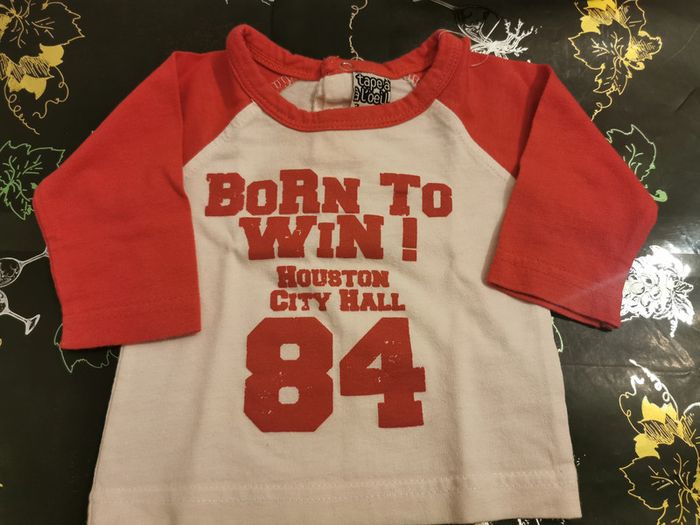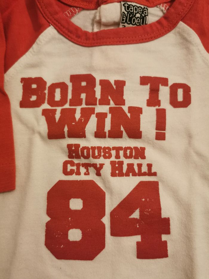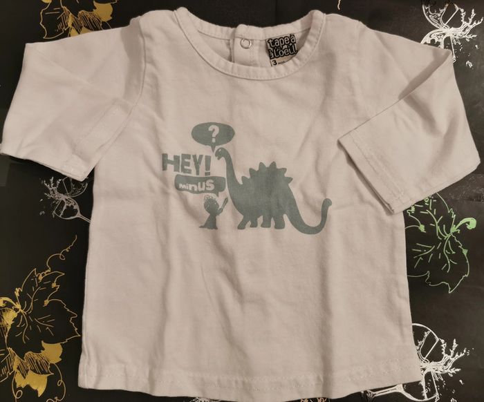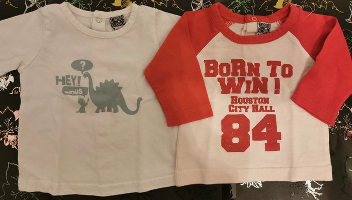 Lot de 2 t-shirts manches longues taille 3 mois : 1 t-shirt "tape à l'œil" blanc motif dinosaure. Boutons pressions dans le dos. En très bon état 1 t-shirt "tape à l'œil" blanc et rouge, le rouge à légèrement déteint sur le blanc. Boutons pressions pour le passage de la tête. En bon état.