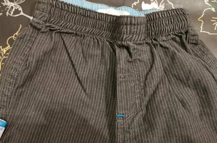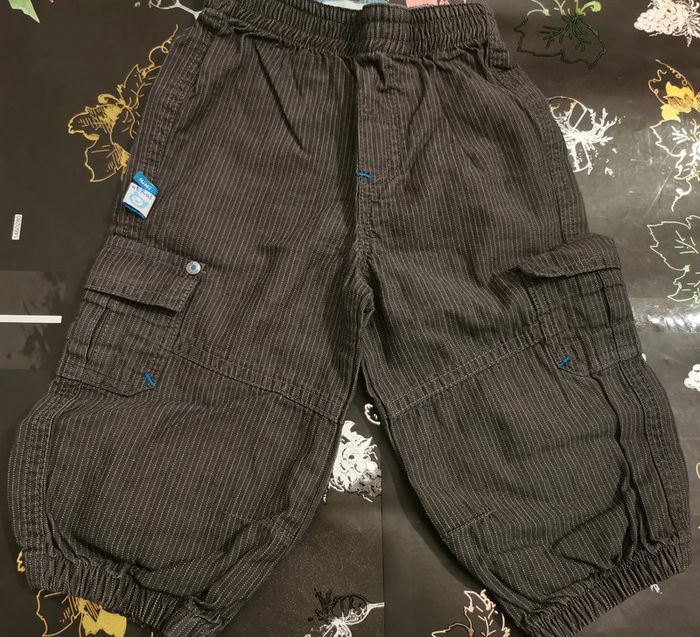 Pantalon rayé gris foncé "gémo" taille 12 mois. Léger, idéal pour la demie saison. Taille élastique, bas des jambes élastique. 2 poches sur le côté. En très bon état.