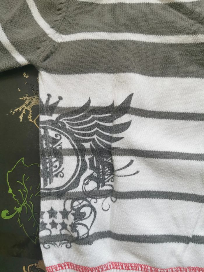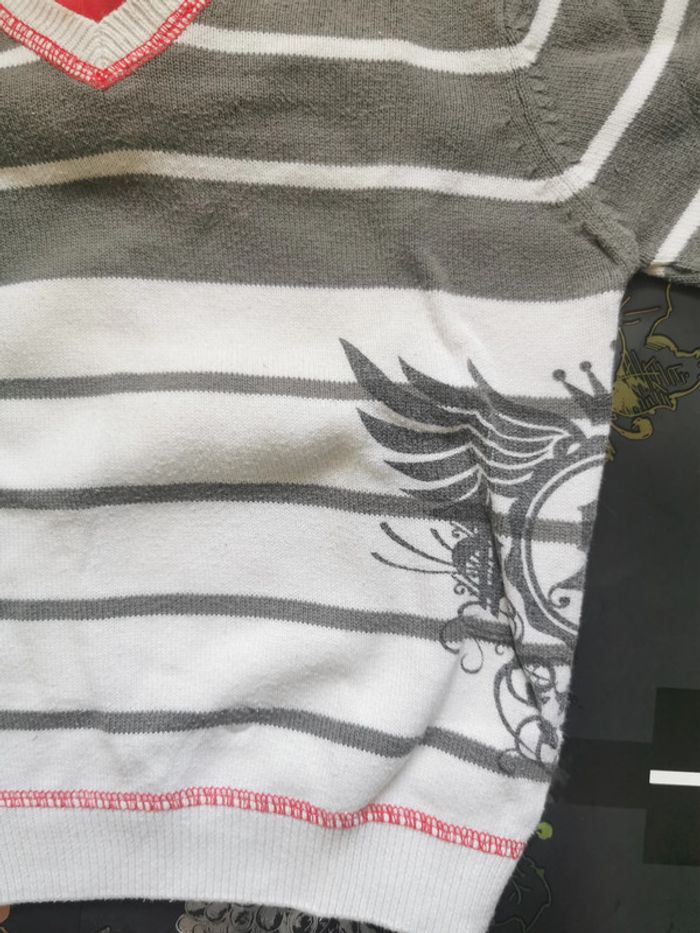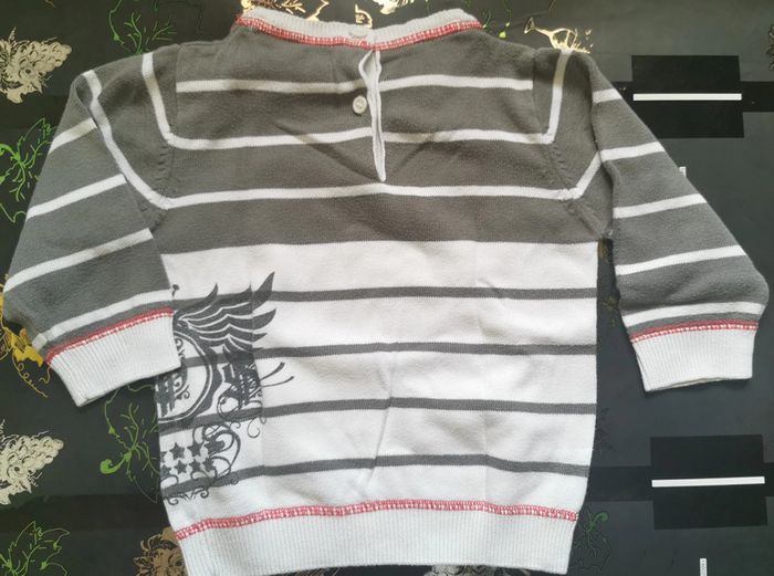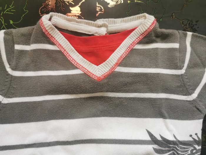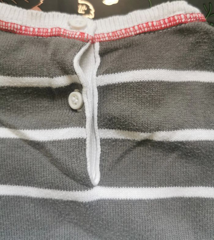 Pull fin taille 12 mois (il n'y a plus l'étiquette de la marque et de la taille). Idéale pour la demie saison ou les soirs d'été. Rayé rouge, gris et blanc avec motif. 2 boutons sur le derrière pour le passage de la tête. En très bon état.