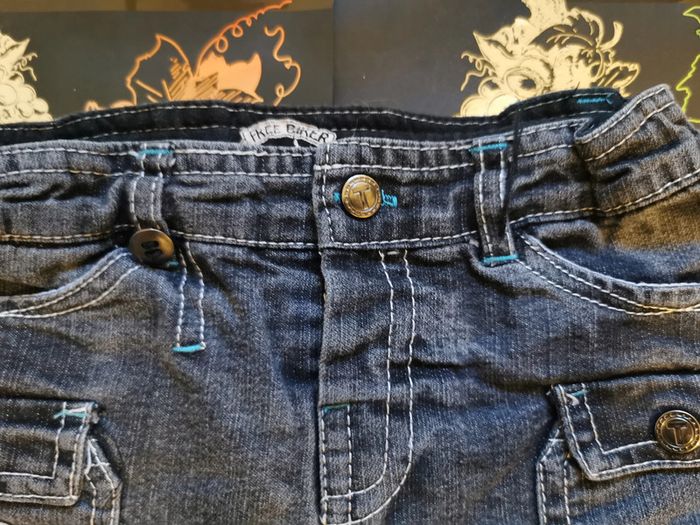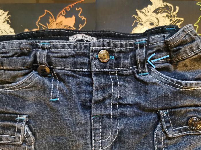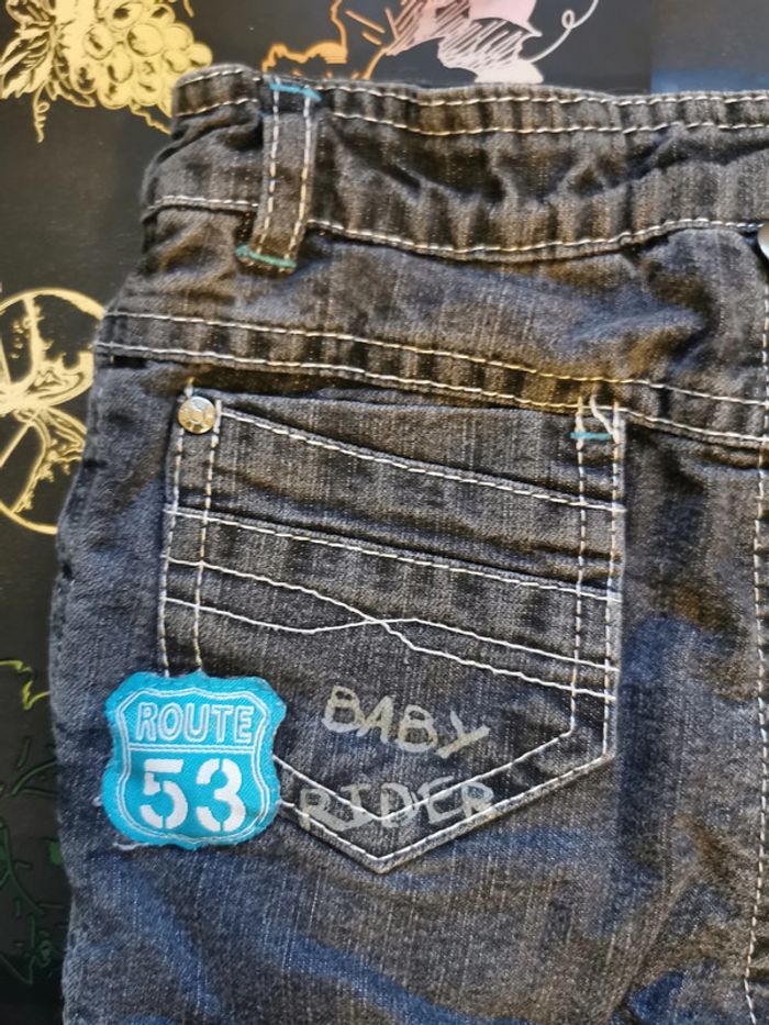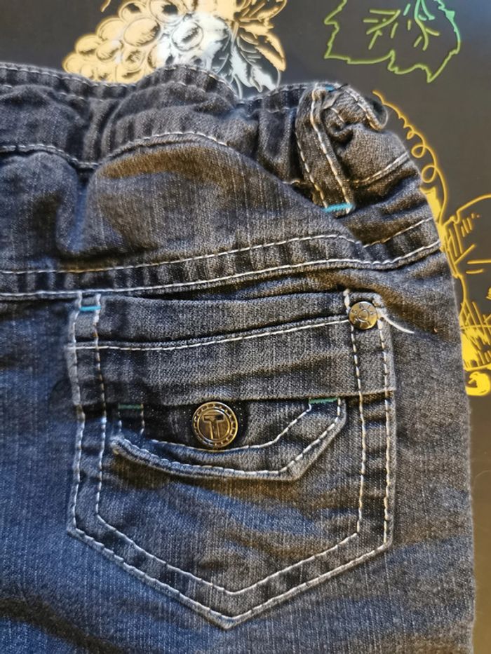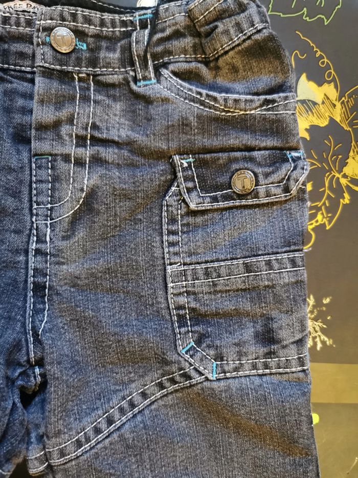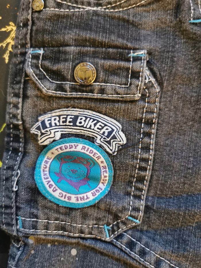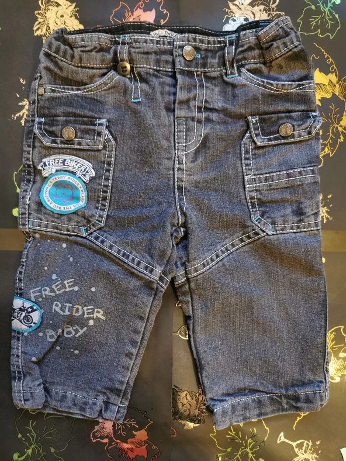 Jeans "tissaia" taille 12 mois bleu foncé avec patch moto biker. Doublé tissus. Ouverture par bouton pression, taille réglable par élastique intérieur. 4 poches sur le devant dont 2 avec boutons pressions. 2 poches sur le derrière. Il manque un bouton de décoration sur un passant (voir flèche de la photo 6). En très bon état.