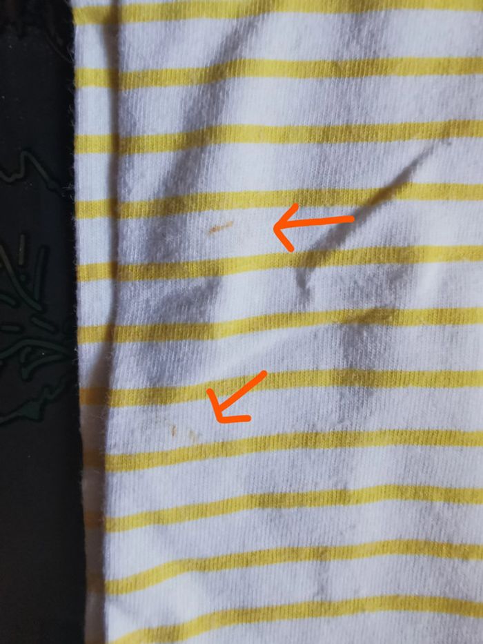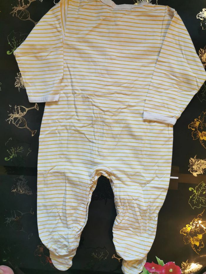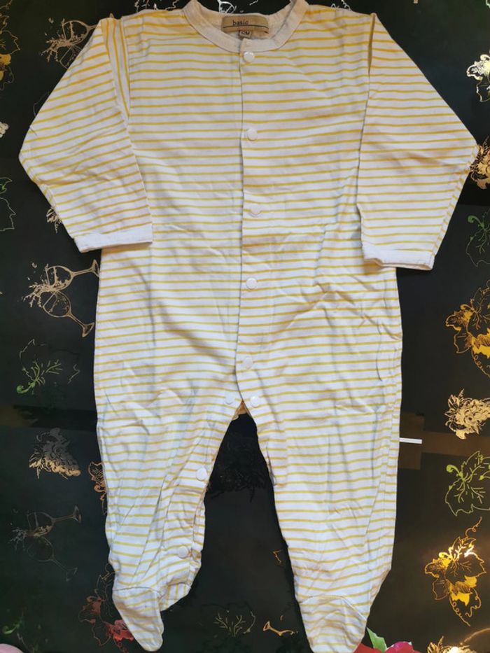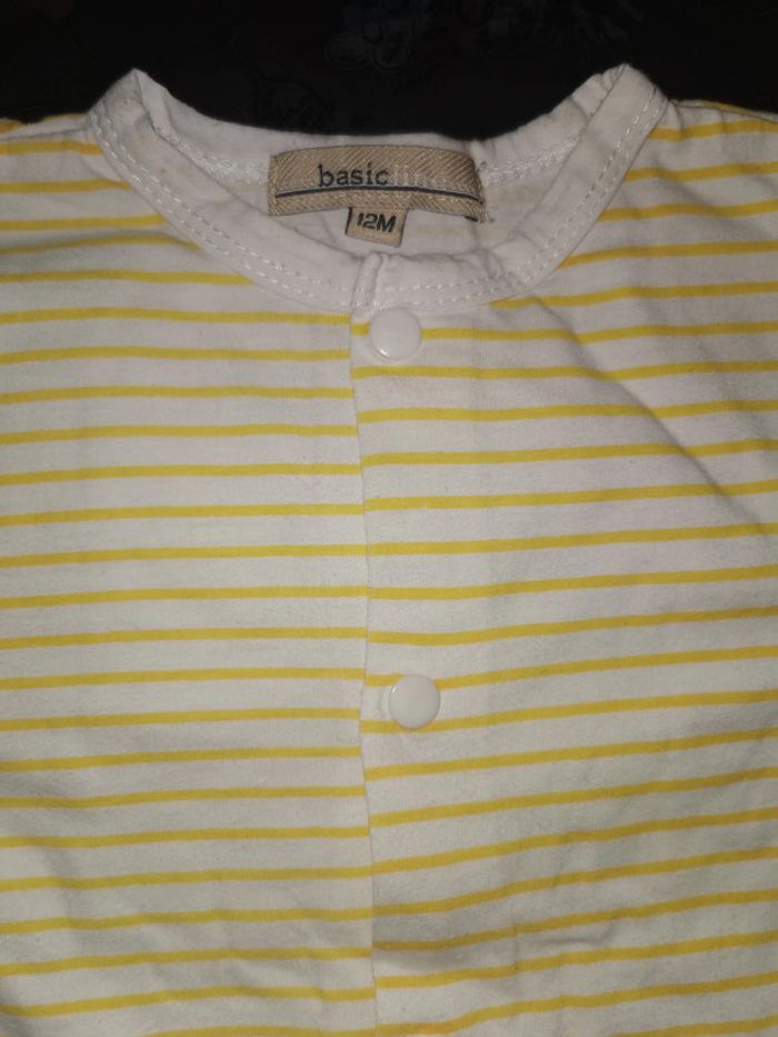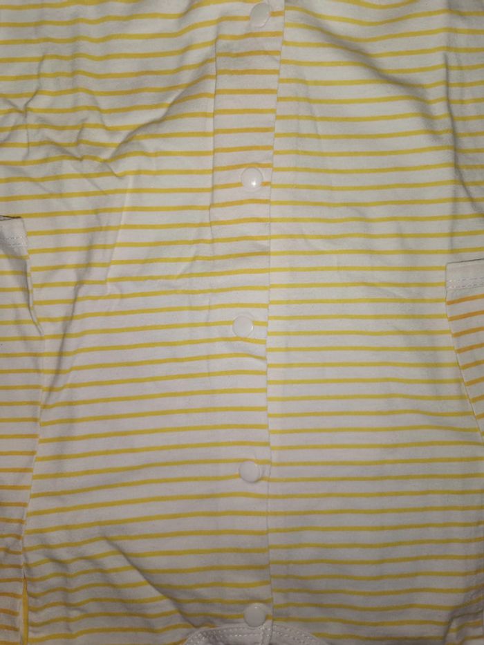 Pyjama "basic" taille 12 mois rayé jaune et blanc. Boutons pressions sur le devant et l'entrejambe. En bon état mais il y a des petites taches sur la manche (voir photo 5 prise de près).