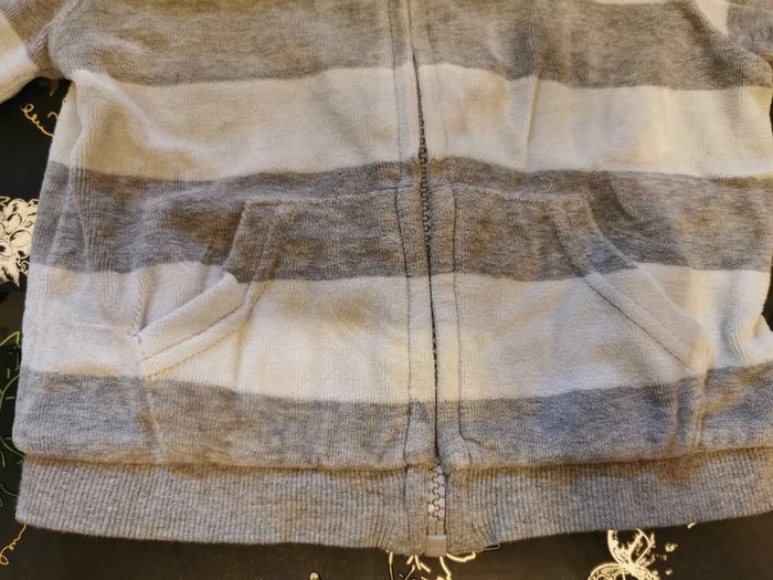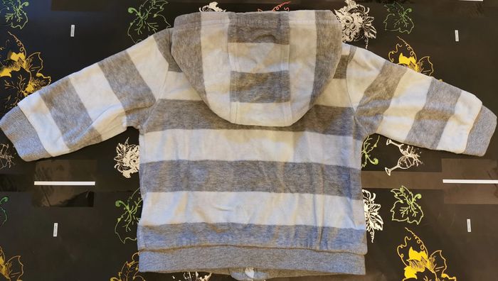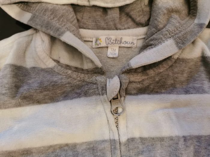 Survêtement "kitchoun" taille 12 mois. matière velours : - gilet zippé rayé gris et bleu clair avec capuche et 2 petites poches sur le devant. - pantalon gris, taille élastique, bas des jambes élastiques. En très bon état.