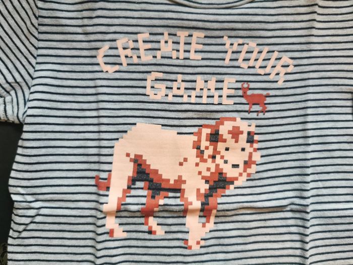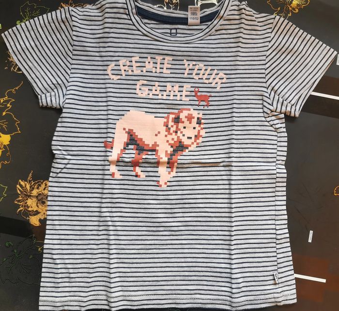 t-shirt manches courtes "okaidi" taille 4 ans rayé gris motif lion. En très bon état mais il a été mis régulièrement. Allez voir mes autres ventes pour ne payer qu'un seul frais de port et que ça soit plus avantageux.