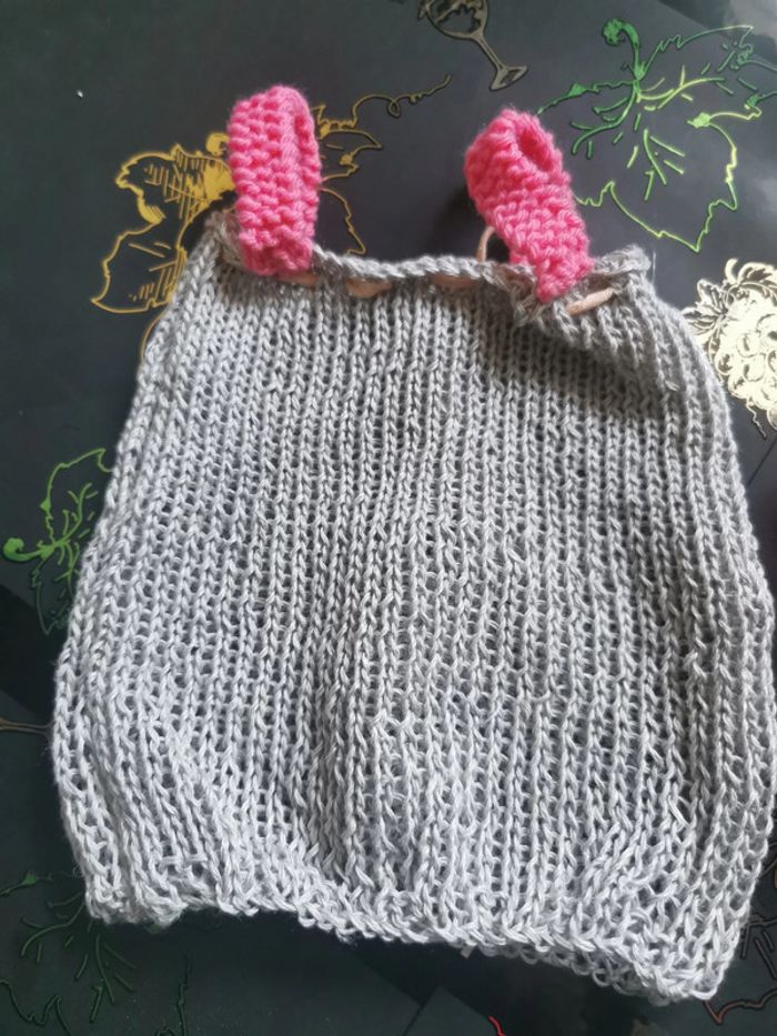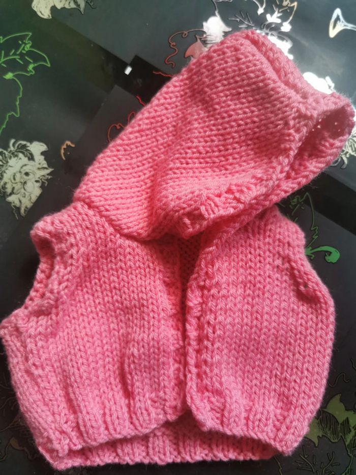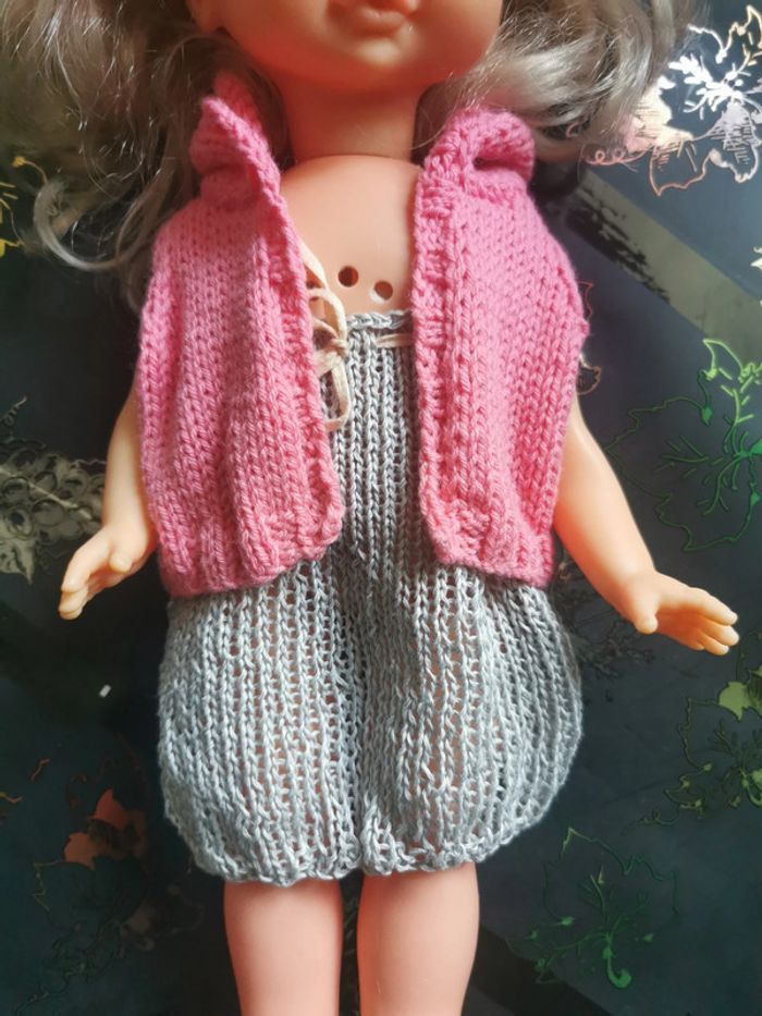 Vêtements tricotés à la main pour poupée de 30 à 40 cm. Robe courte grise avec bretelles roses et cordon de resserrage sur le haut. Gilet à capuche sans manche rose. Ces habits ont été tricotés par ma maman qui est passionnée par le tricot, ils sont neufs. Vendus sans la poupée, elle sert juste de "mannequin".