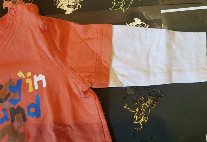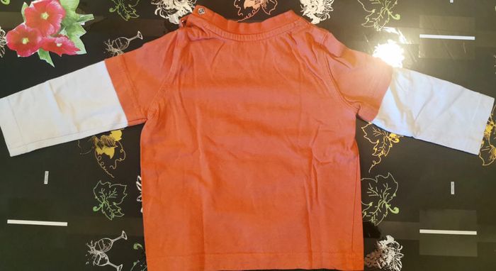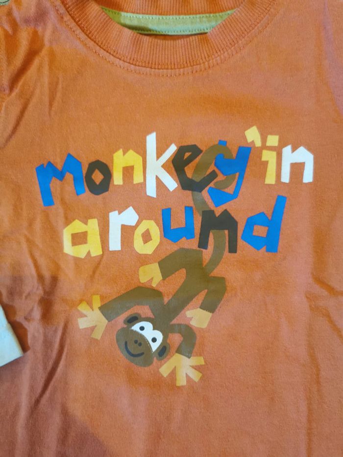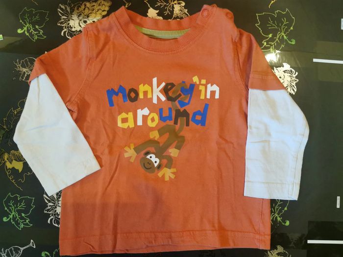 t-shirt manches longues superposées taille 6-9 mois orange et blanc motif singe. 2 boutons pressions pour le passage de la tête. En très bon état. Allez voir mes autres ventes pour ne payer qu'un seul frais de port.