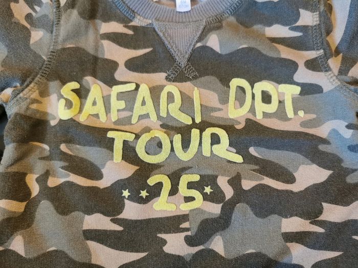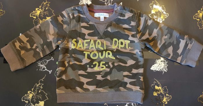 sweat "kitchoun" taille 6 mois. Kaki camouflage. 2 boutons pressions pour le passage de la tête. En très bon état.